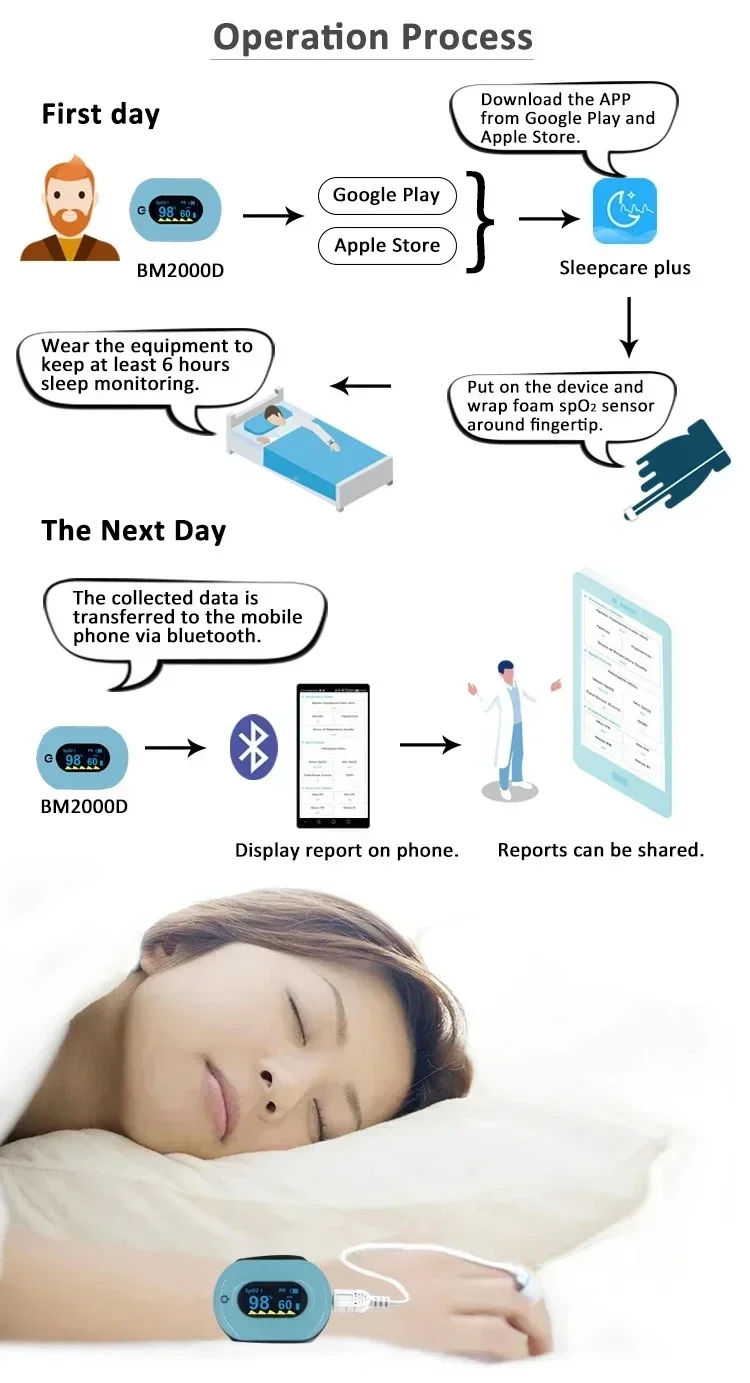 1 monitor de apnea del sueño BM2000D. 2X sensor SpO2 de espuma desechable