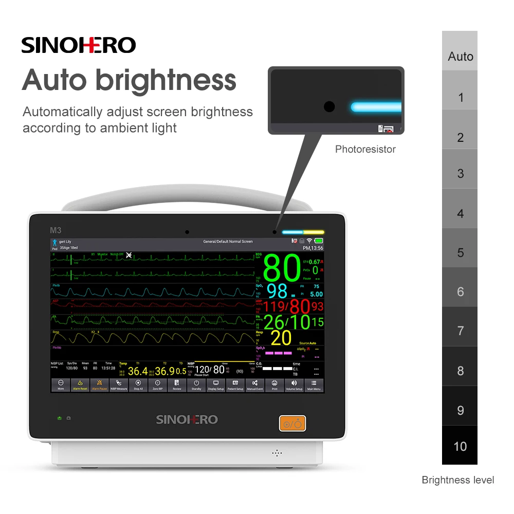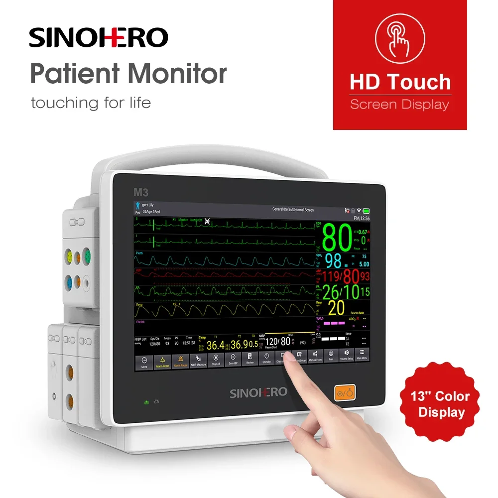 SINOHERO AcuitSign M3 es un módulo monitris aplicable para monitoreo clínico en quirófano, quirófano postoperatorio, quirófano/CCU, quirófano, etc. de adultos, pediátricos y recién nacidos.Los parámetros vitales del paciente (ECG (incluida la medición del segmento ST y el análisis de volontmia), RESP, SPO2, PR, NIBP, TEMP, IBP y CO, etc.)Se puede monitorear. La información monitoreada se puede mostrar, revisar, imprimir y almacenar.
