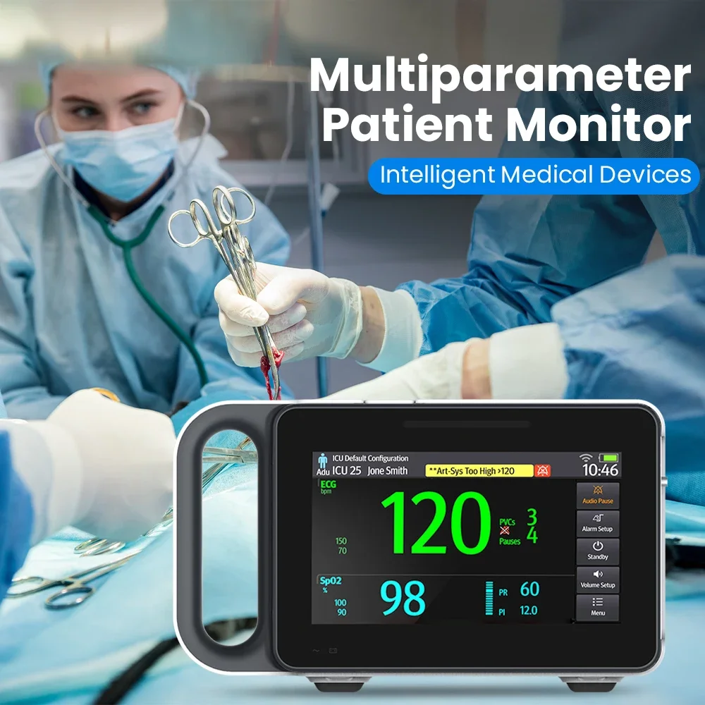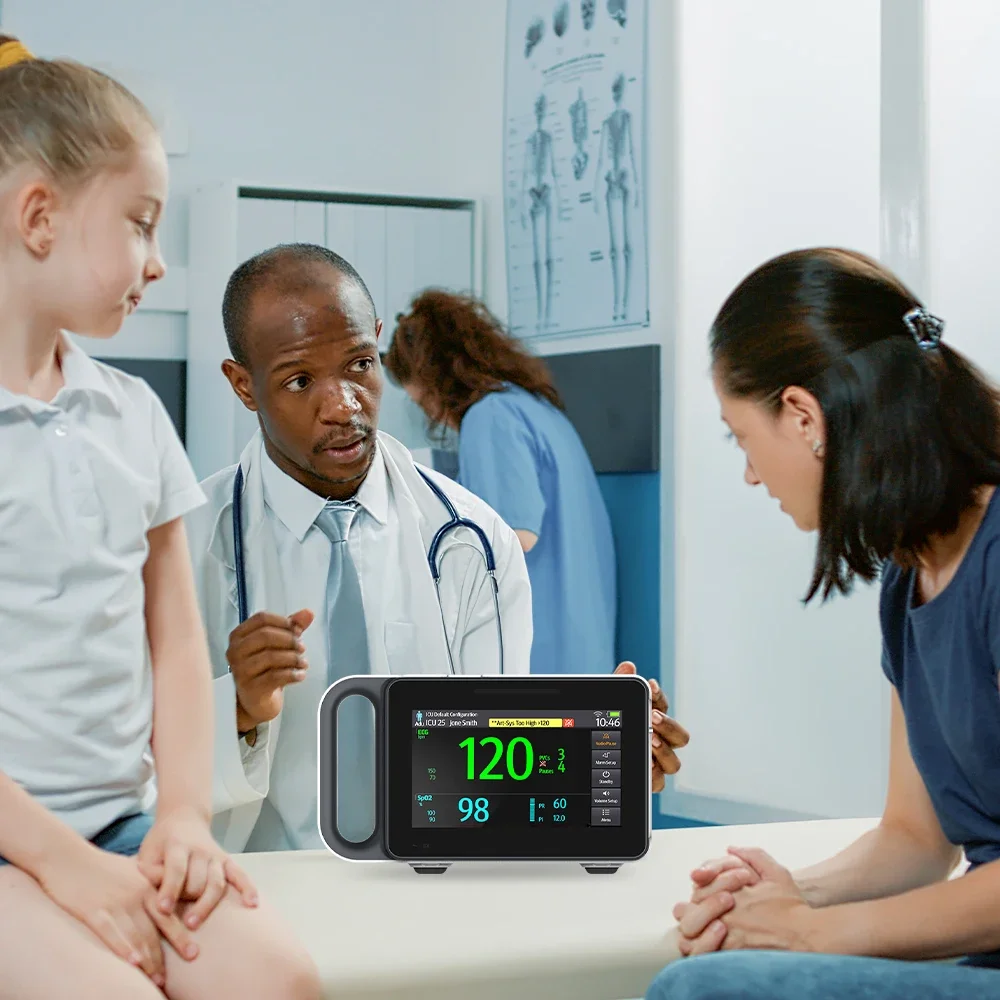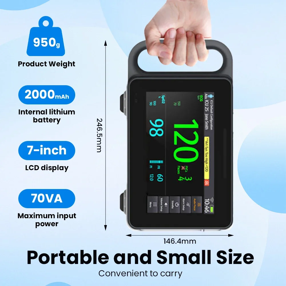 E7A Monitor de paciente médico de uso humano multiparámetro TFT Pantalla táctil de 7 pulgadas Monitor de señales vitales portátiles SPO2 NIBP PR TEMP ECG, este monitor de paciente de pantalla táctil portátil tiene abundantes funciones, que se pueden utilizar para el seguimiento de adultos, pediátricos y recién nacidos.Está alimentado por 100 V-240 V~ 50 Hz/60 Hz.Los usuarios pueden seleccionar diferentes configuraciones de parámetros según los requisitos.Muestra datos y formas de onda en tiempo real mediante una pantalla LCD TFT en color de 7''.