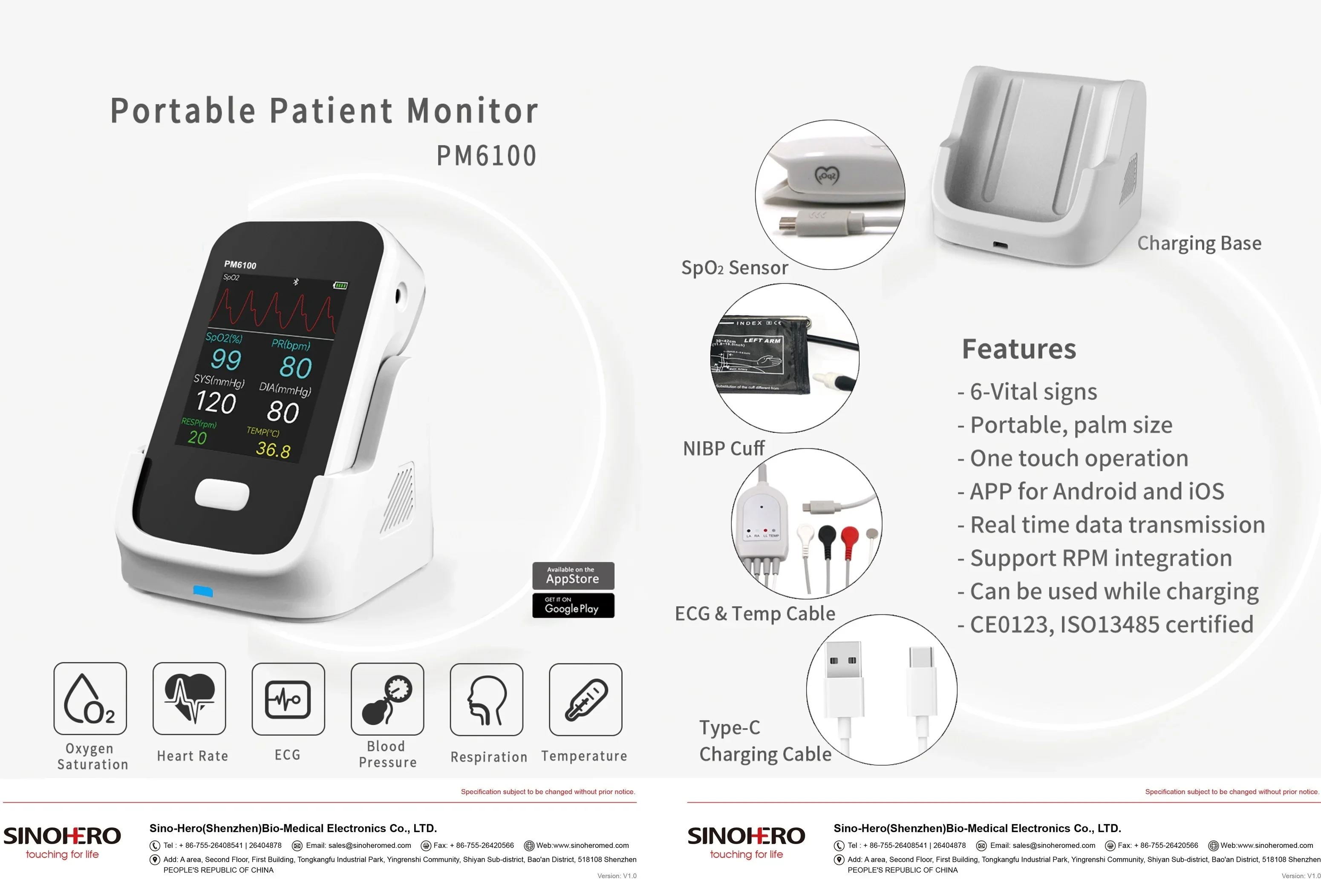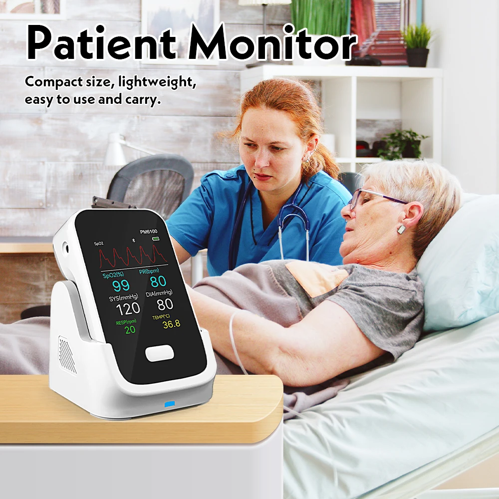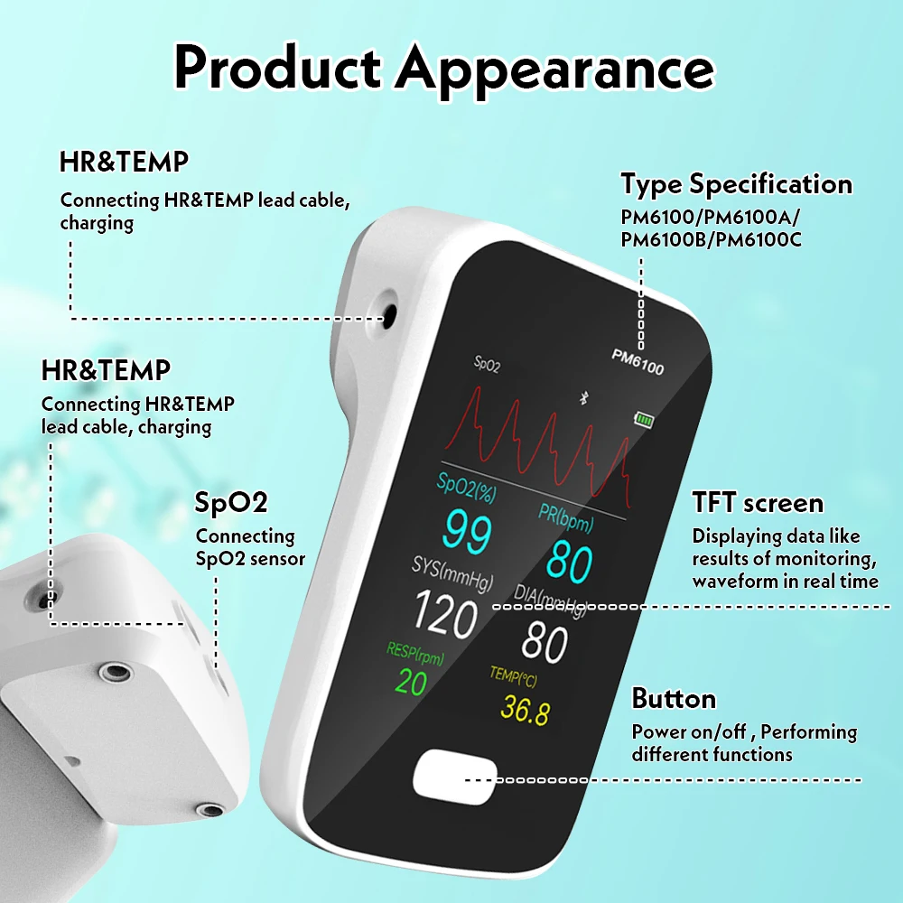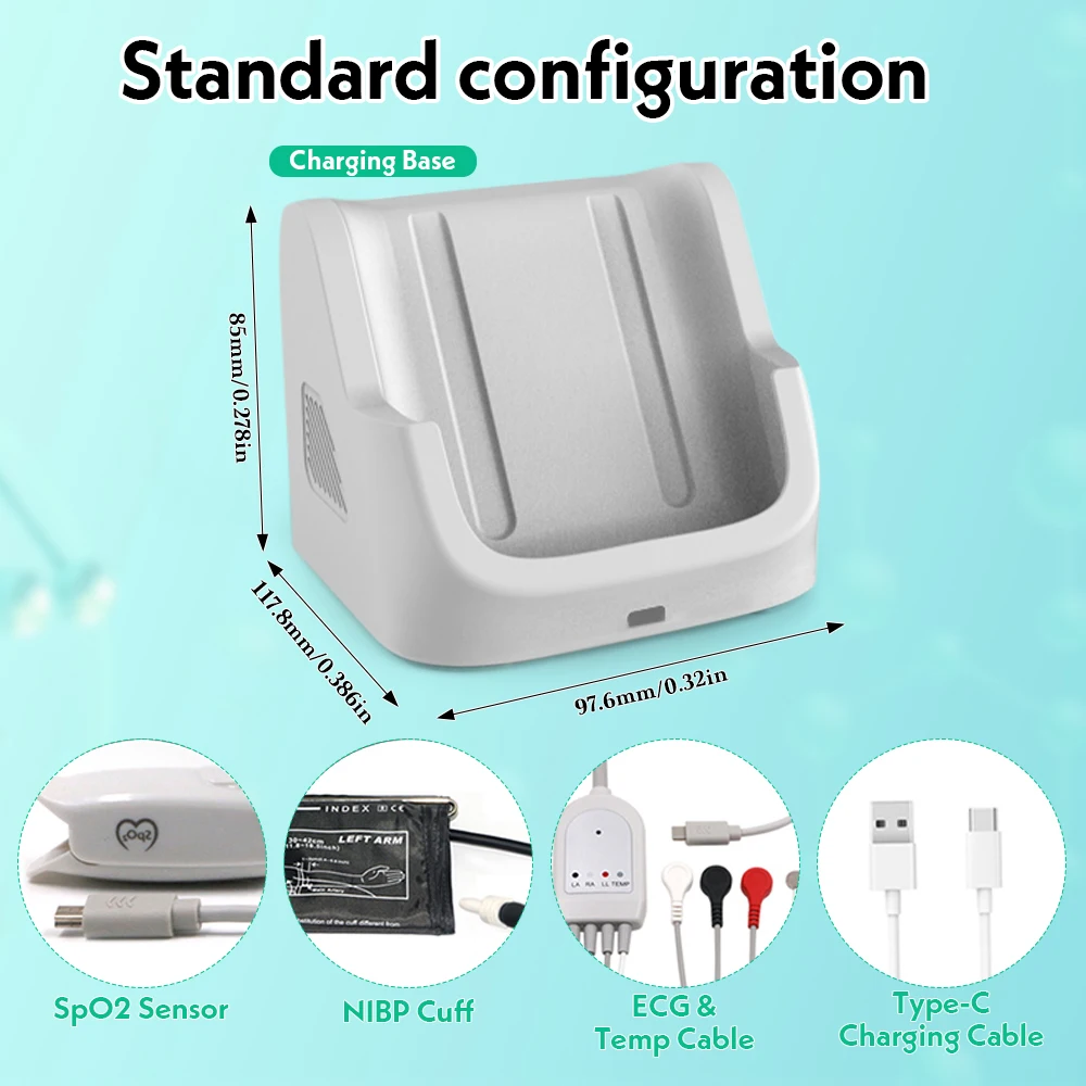Wireless charging, TYPE C universal interface, specific blood oxygen sensor and blood pressure cuff, and ECG consumables. The quipment is simple to operate, small in appearance, convenient to carry, and is a reliable vital sign monitoring equipment.