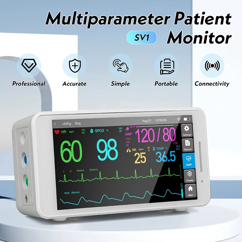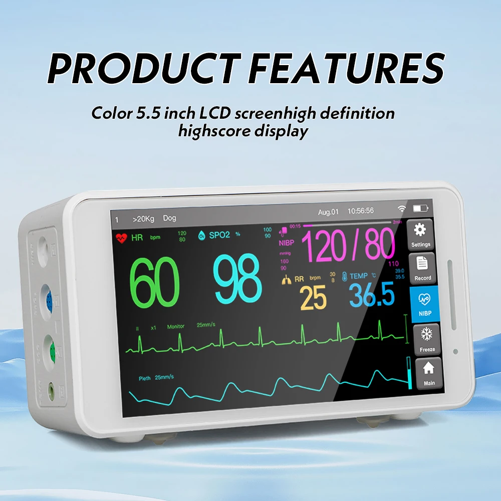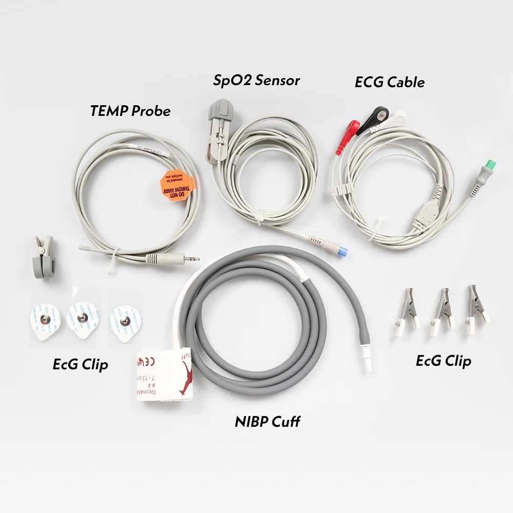 2) Monitoring Accessories maximal compatibility for all major brands (GE, Philips, Schiller, Collin, CSI, Critikon, Nihon Kohden, etc.): including, Reusable Spo2 Sensor & Ext-Cable, ECG cable, EKG cable, NIBP cuff, Air-hose, Temp probe