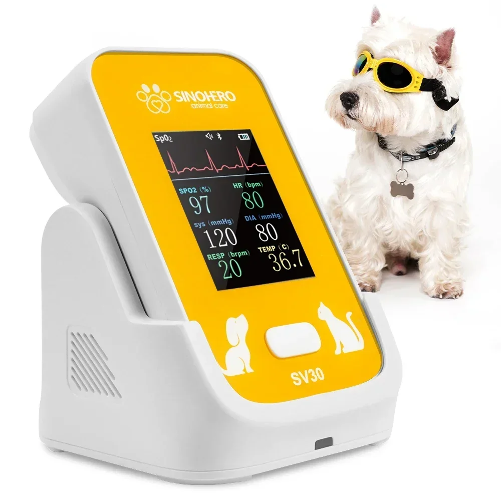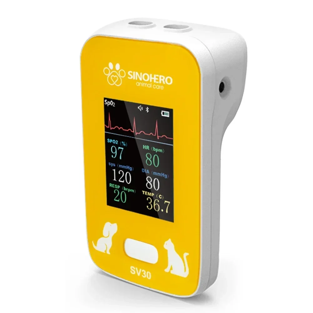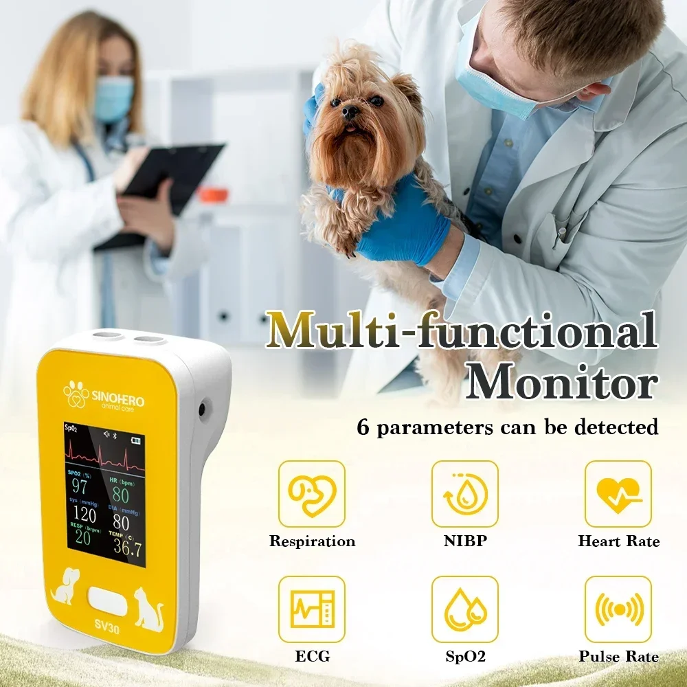 El monitor veterinario SV30 es capaz de monitorear parámetros: ECG (eletrocardiógrafo), HR (frecuencia cardíaca), NIBP (presión arterial no invasiva), SpO2, PR (frecuencia del pulso), TEMP (temperatura corporal)