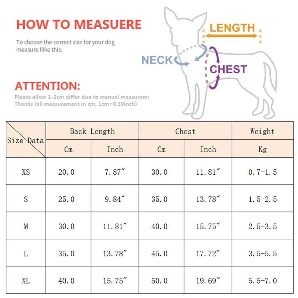 1. Por favor, compruebe las medidas de su mascota para asegurarse de que la ropa se ajuste a las mascotas antes de realizar el pedido (1 pulgada=2,54 cm)