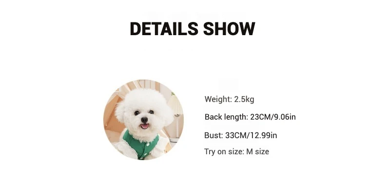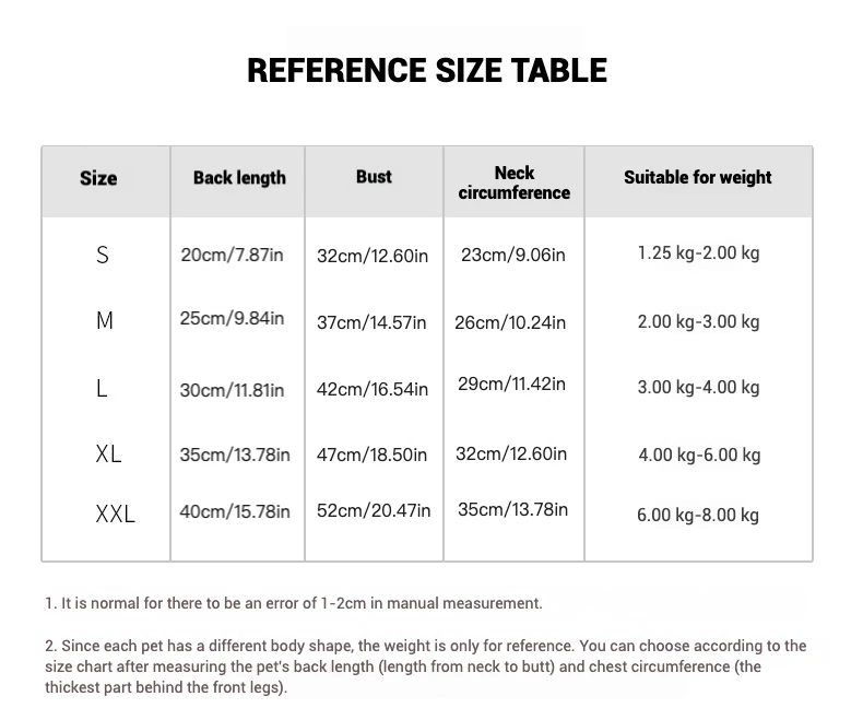 Es normal que haya un error de 1-2 cm en la medición manual.Dado que cada mascota tiene una forma corporal diferente, el peso es solo como referencia.Puede elegir de acuerdo con la tabla de tallas después de medir la longitud de la espalda de la mascota (longitud desde el cuello hasta el trasero), el busto (la parte más gruesa detrás de las piernas delanteras) y la circunferencia del cuello.