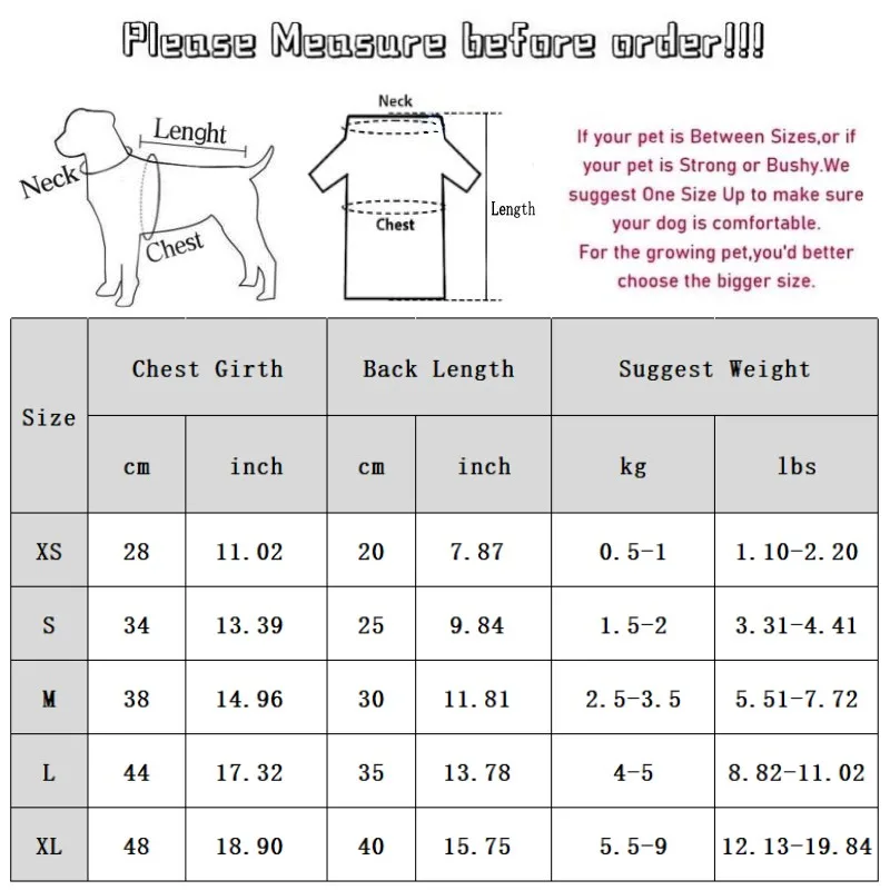 XS: Pecho 28 cm/11,02''; Longitud 20 cm/7,87''; Peso sugerido 0,5-1 kg/1,10-2,20 lbs.