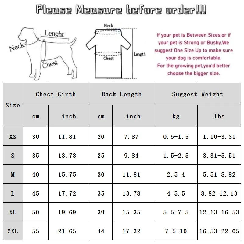 2XL: Pecho 55 cm/21,65''; Longitud 44 cm/17,32 pulgadas; Peso sugerido 7,5-10 kg/16,5-22,05 libras.