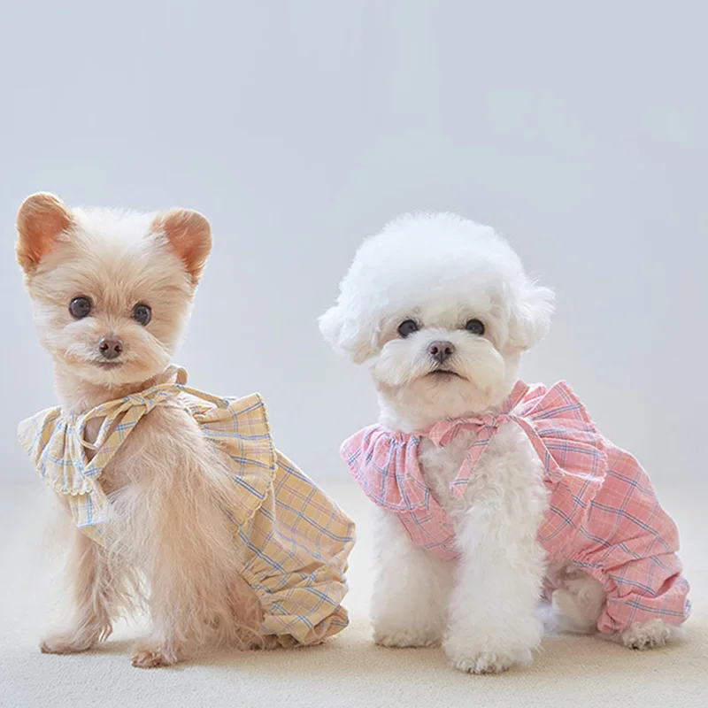 Mono de primavera para mascotas, bonito mono a cuadros con hombros diagonales, mono de dos patas para primavera, ropa para cachorros, pijamas