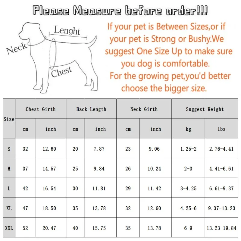 XXL: pecho 52cm/20,47 ''; longitud 40cm/15,75''; Cuello 35cm/13,78 ''; peso recomendado 6-9 kg/13,23-19,84 lbs.
