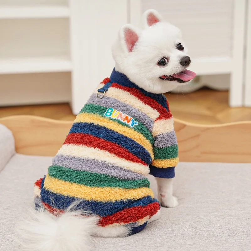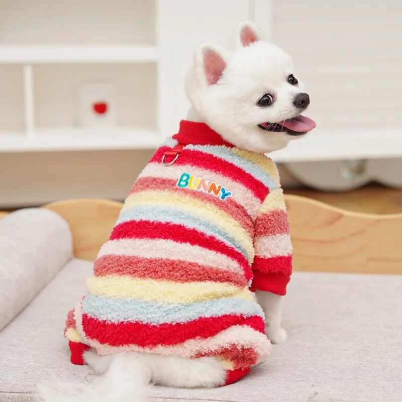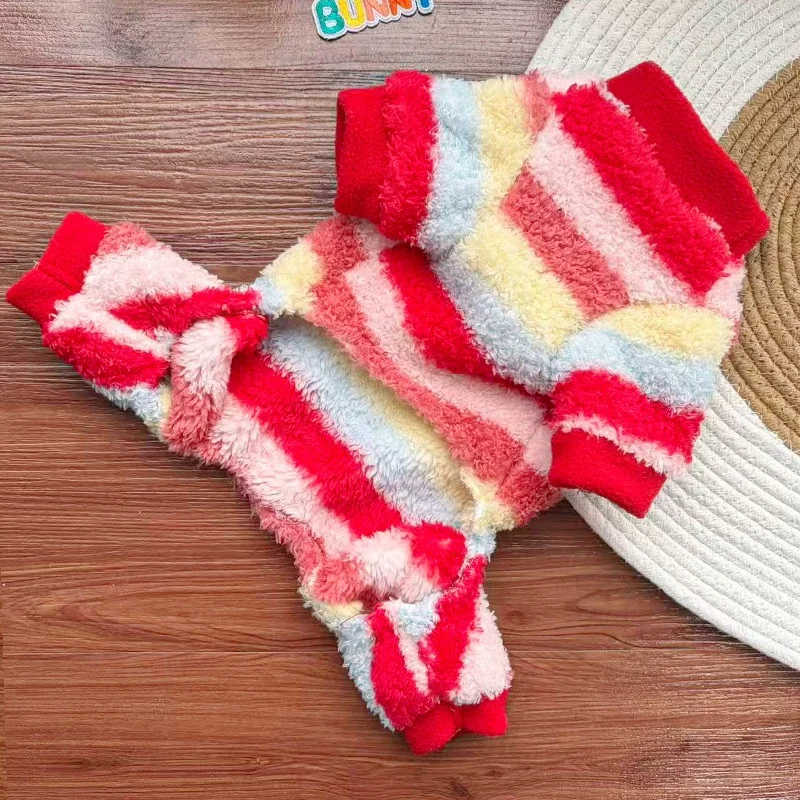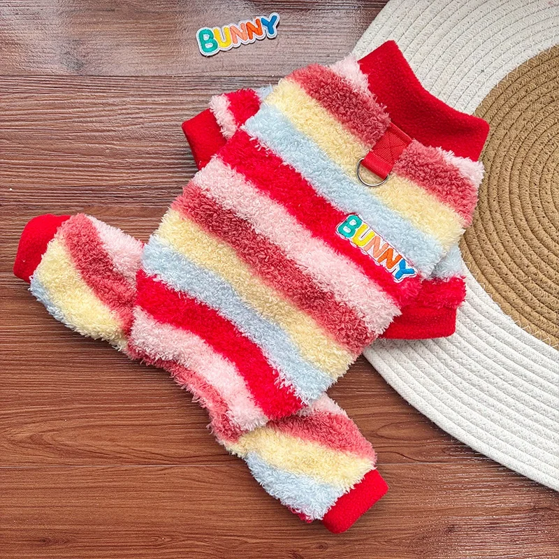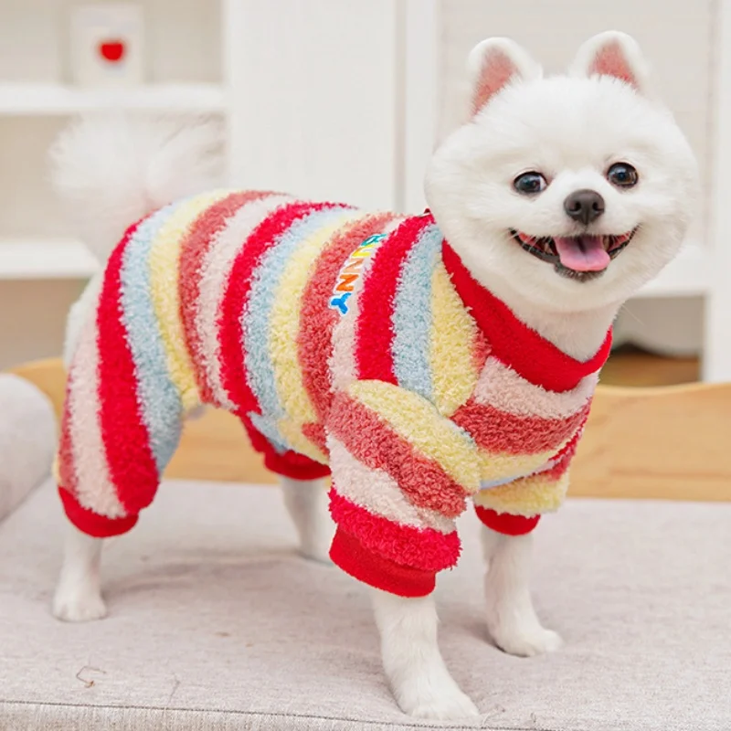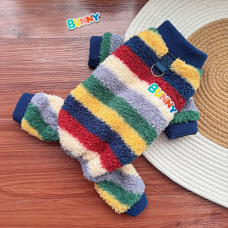 Monos de felpa para perros de invierno, ropa suave y cálida para perros, chaqueta para cachorro a rayas de arcoíris, peleles con estampado de letras para gatos, monos para mascotas, pijamas para perros