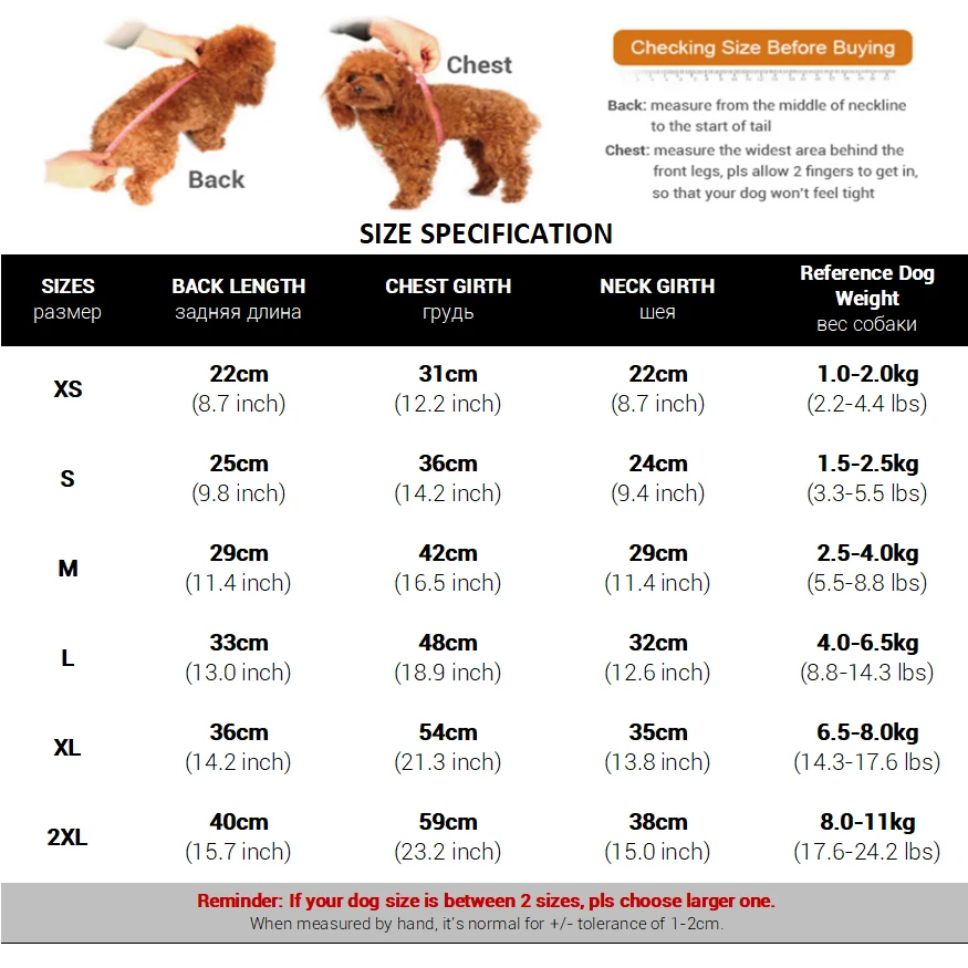 Por favor mide la de tu mascota.Longitud de la espaldayTamaño del pecho¡antes de comprar!