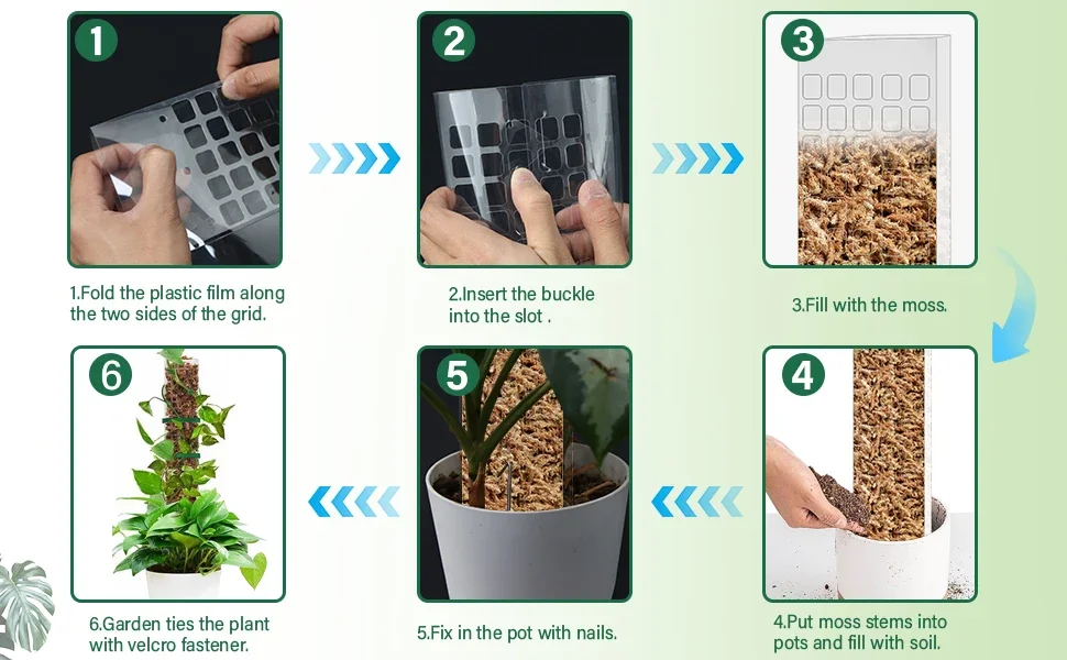 [Fácil de instalar y diseño sólido]: Nuestras varillas de plástico para musgo son muy prácticas y se pueden instalar fácilmente. El poste de musgo de la planta tiene dos líneas de plegado, que se pliegan a lo largo de la línea de plegado para formar un musgo semicircular (en forma de D). ¡No lo enrolle directamente en forma cilíndrica! Llénelo de musgo, insértelo en el suelo alrededor de los tallos de las plantas, fije los tallos con una corbata de jardín y luego inserte la estaca de madera del suelo.
