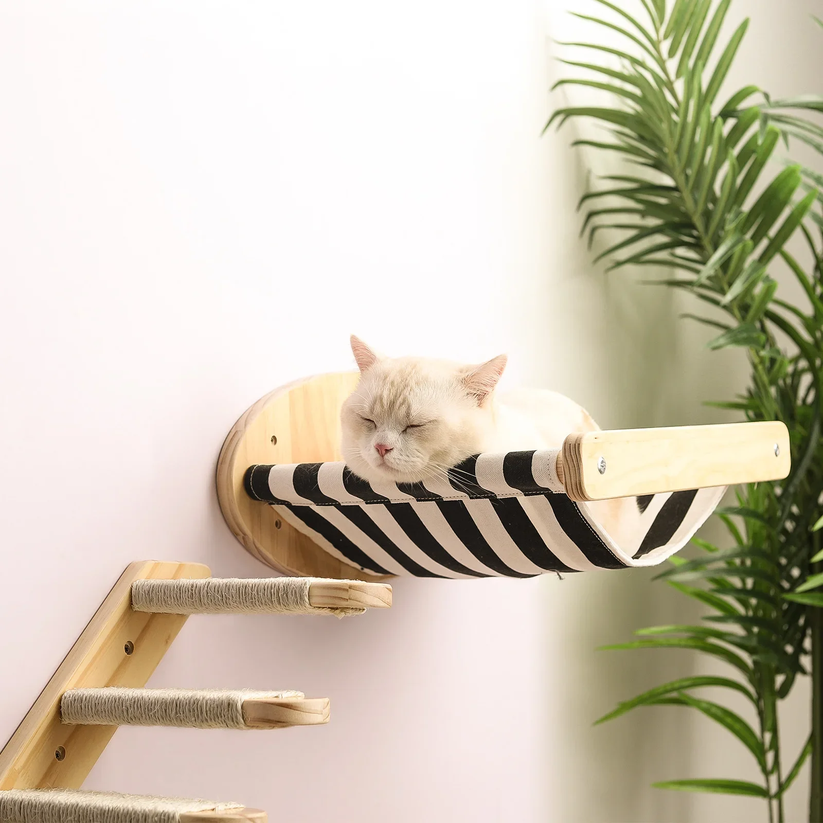 Esta hamaca se fija directamente a la pared y proporciona un espacio vertical para que su gato pueda posar, trepar y observar el entorno.