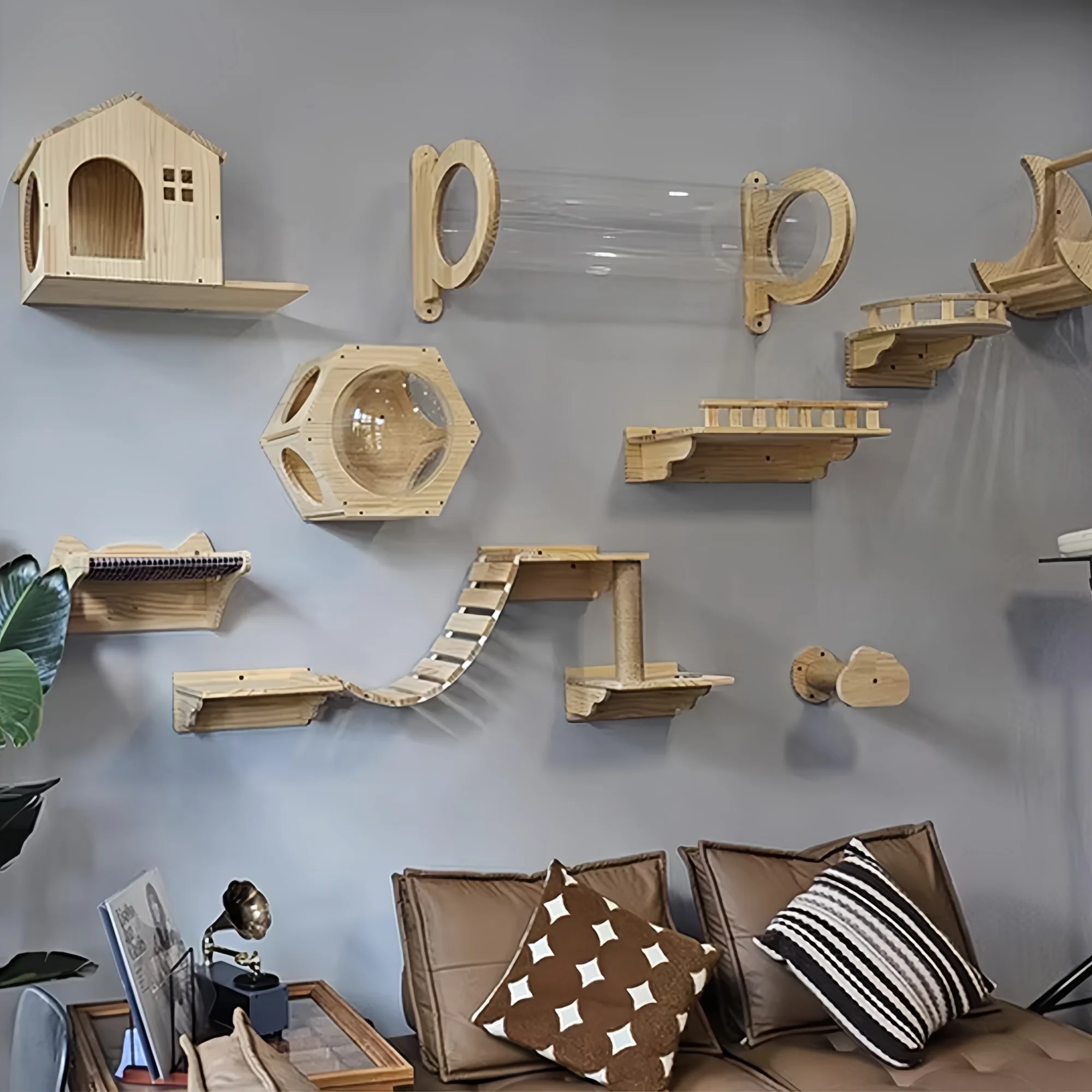 ¡Convierte tu hogar en un paraíso para gatos con nuestro estante para gatos montado en la pared!Este conjunto de muebles para gatos está fabricado en madera natural de alta calidad, combinado con cojines suaves y cómodos, lo que proporciona un lugar ideal para que los gatos domésticos trepen, descansen y observen su "territario".Ya sea que viva en un apartamento pequeño o en una mansión espaciosa, el diseño que ahorra espacio no solo satisface la naturaleza de los gatos, sino que también agrega estilo a su hogar.