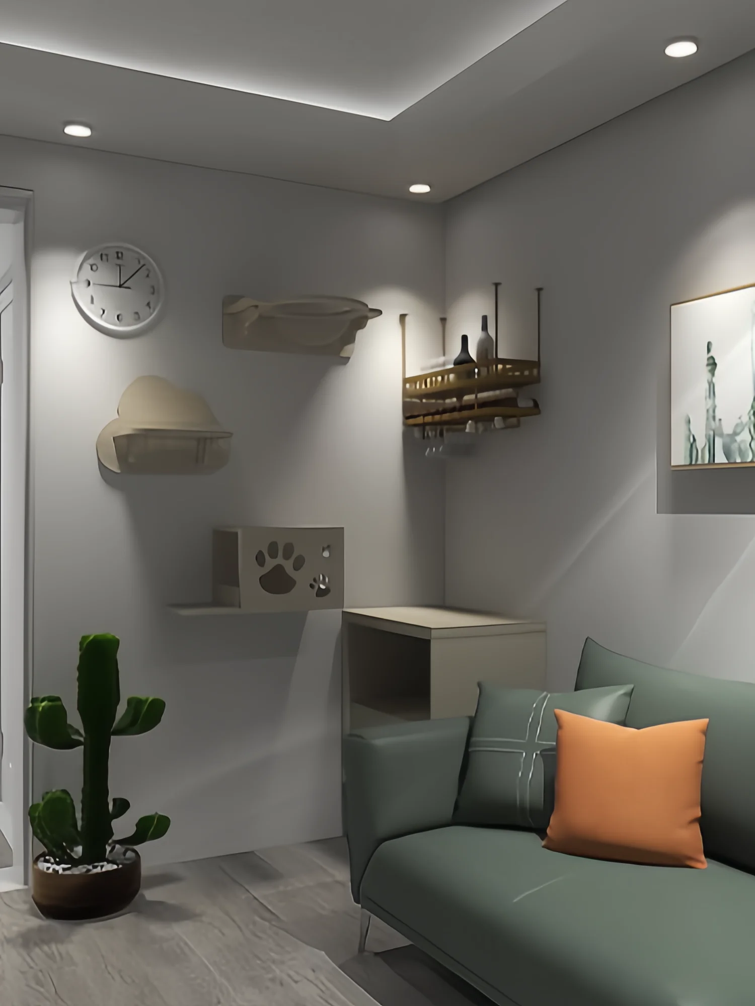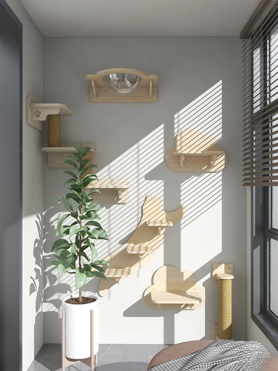 * Juguetes: el dueño puede colocar los juguetes favoritos del gato en la pared del gato y el gato trepará para jugar con el juguete.
