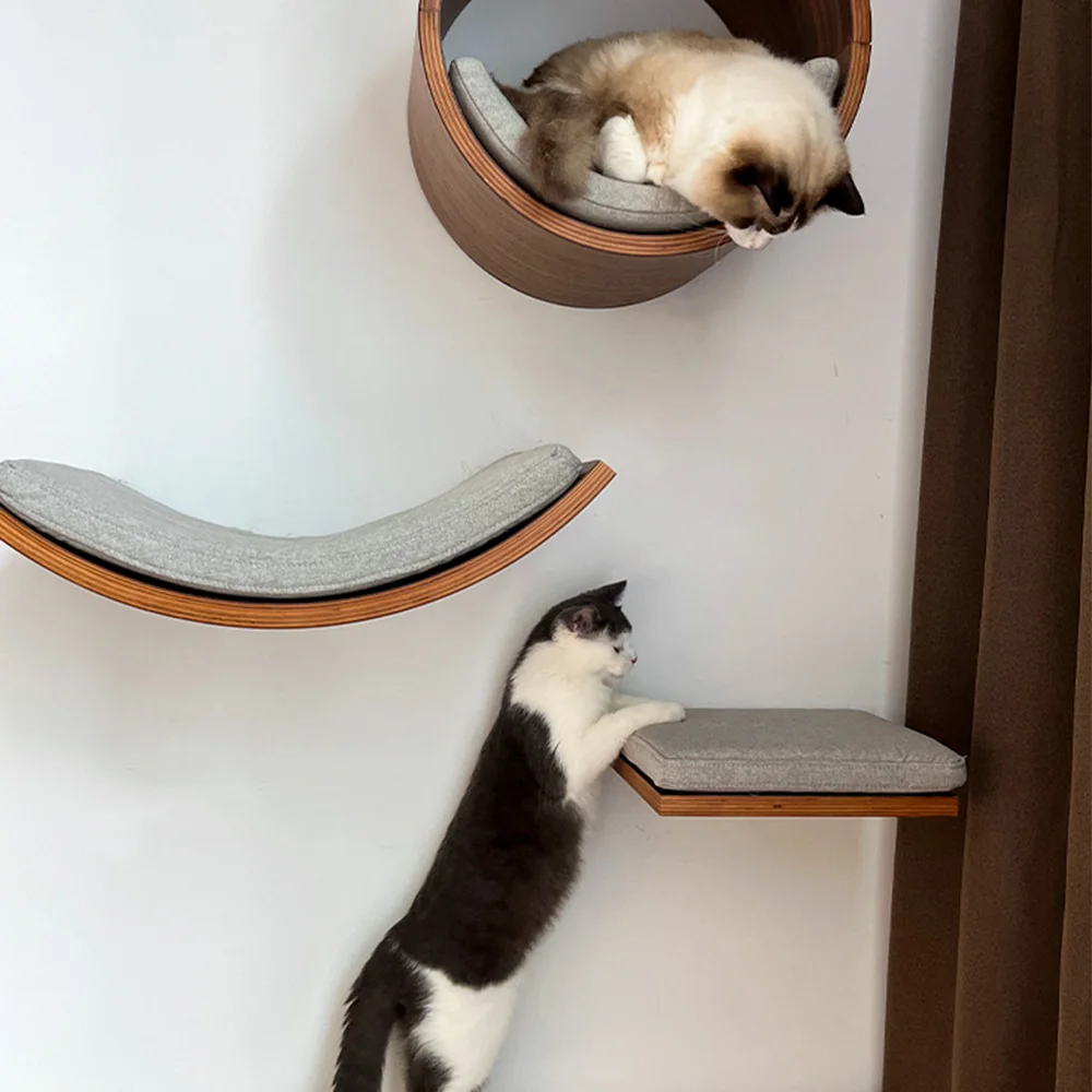Muebles interactivos de escalada para gatos Estantes de madera montados en la pared con percha y hamaca acolchados suaves para gatitos trepar y jugar