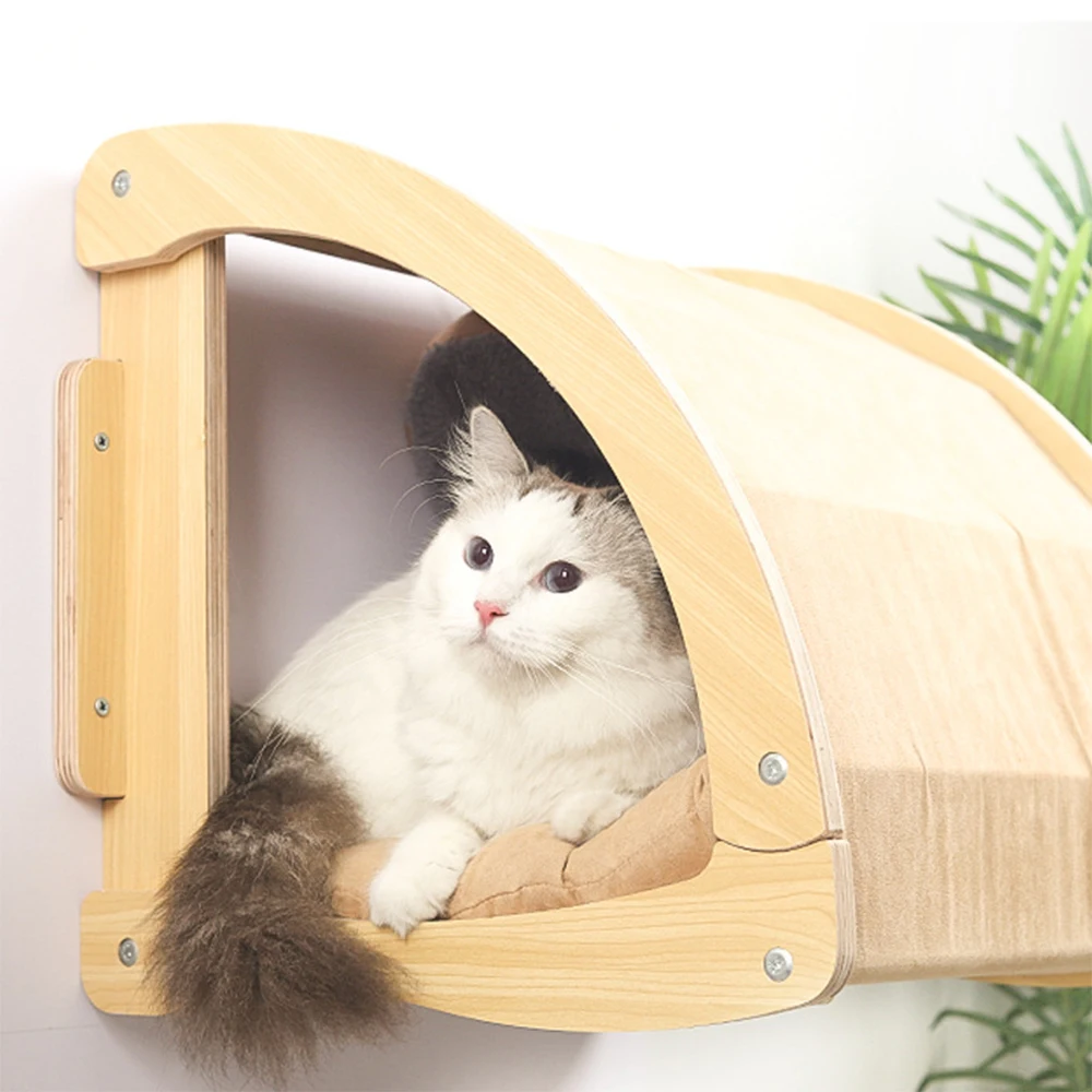 Muebles de madera maciza montados en la pared para gatos, escalera de escalada y hamaca para gatos con poste rascador para actividades, perchas para gatos de interior