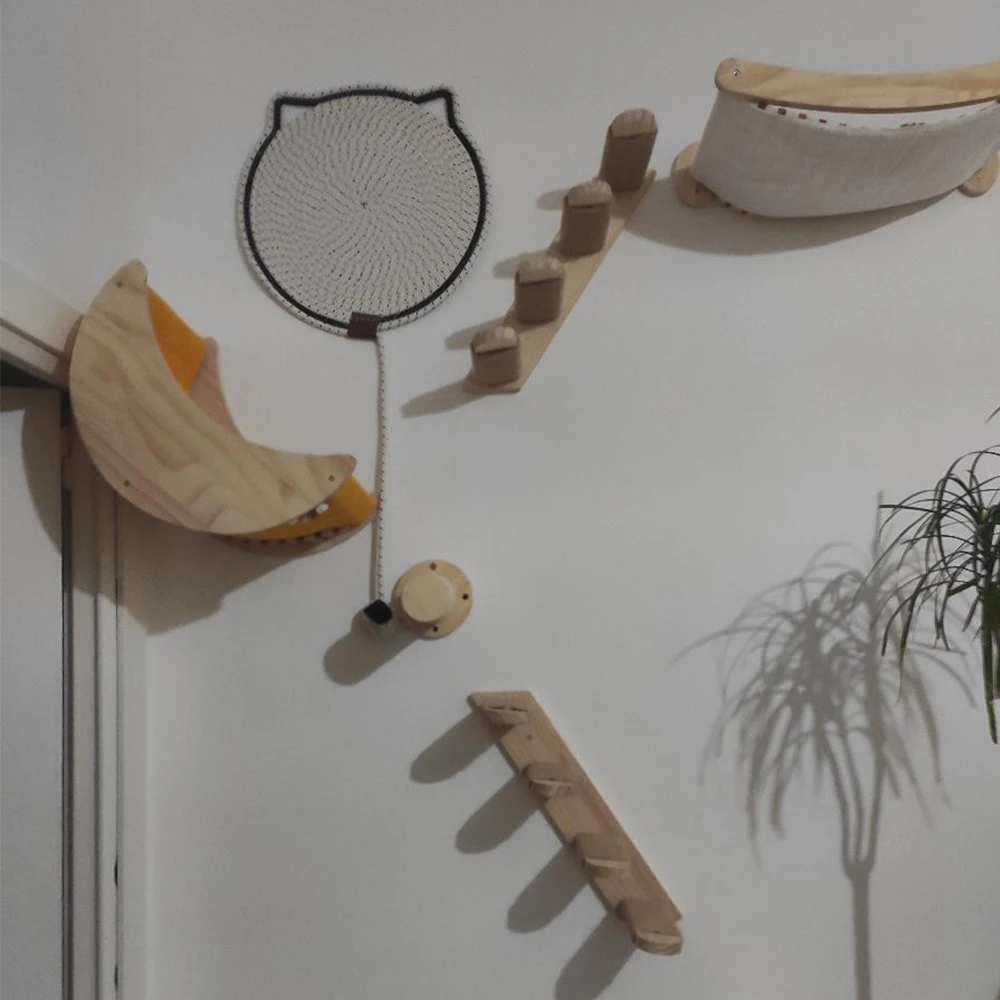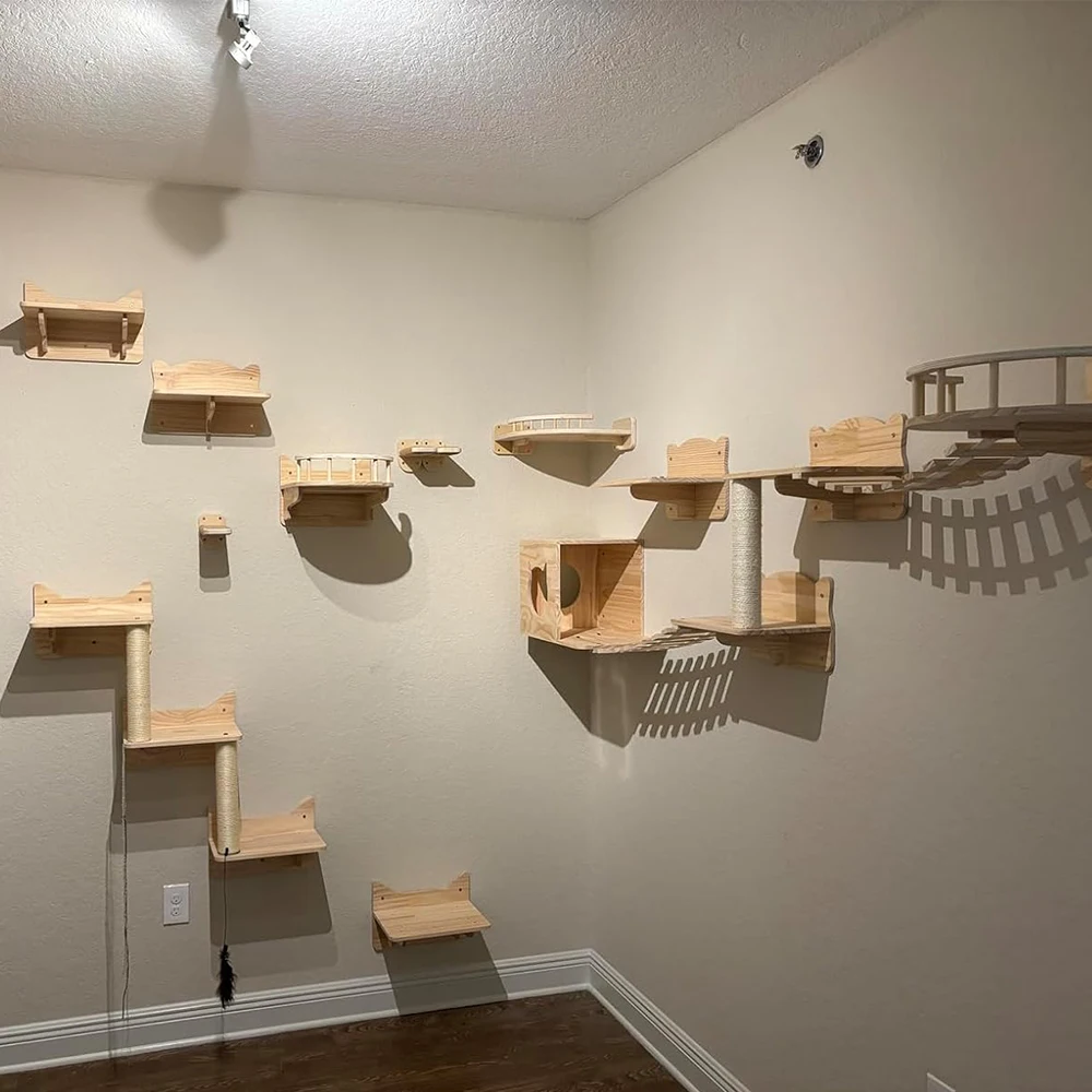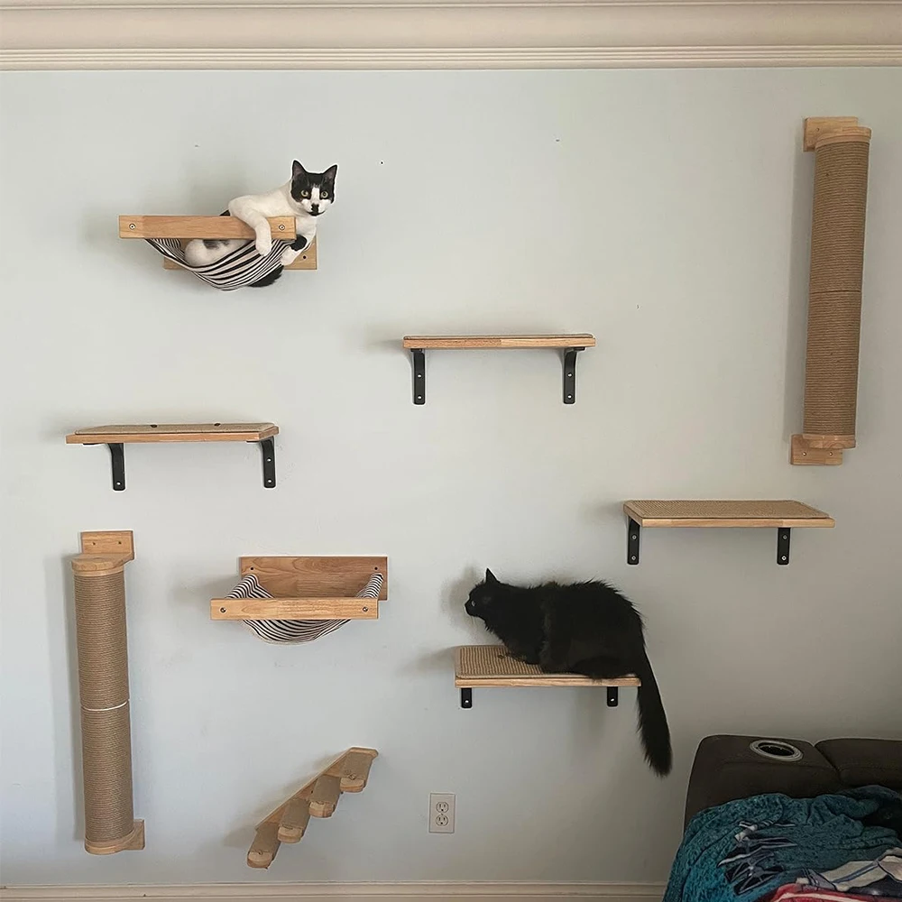 Los estantes de pared para gatos satisfacen el hábito de los gatos de escalar, aumentando el ejercicio y reduciendo la posibilidad de obesidad, lo que es bueno para la salud. Además, le da a los gatos espacio para trepar y evitar estropear el hogar.