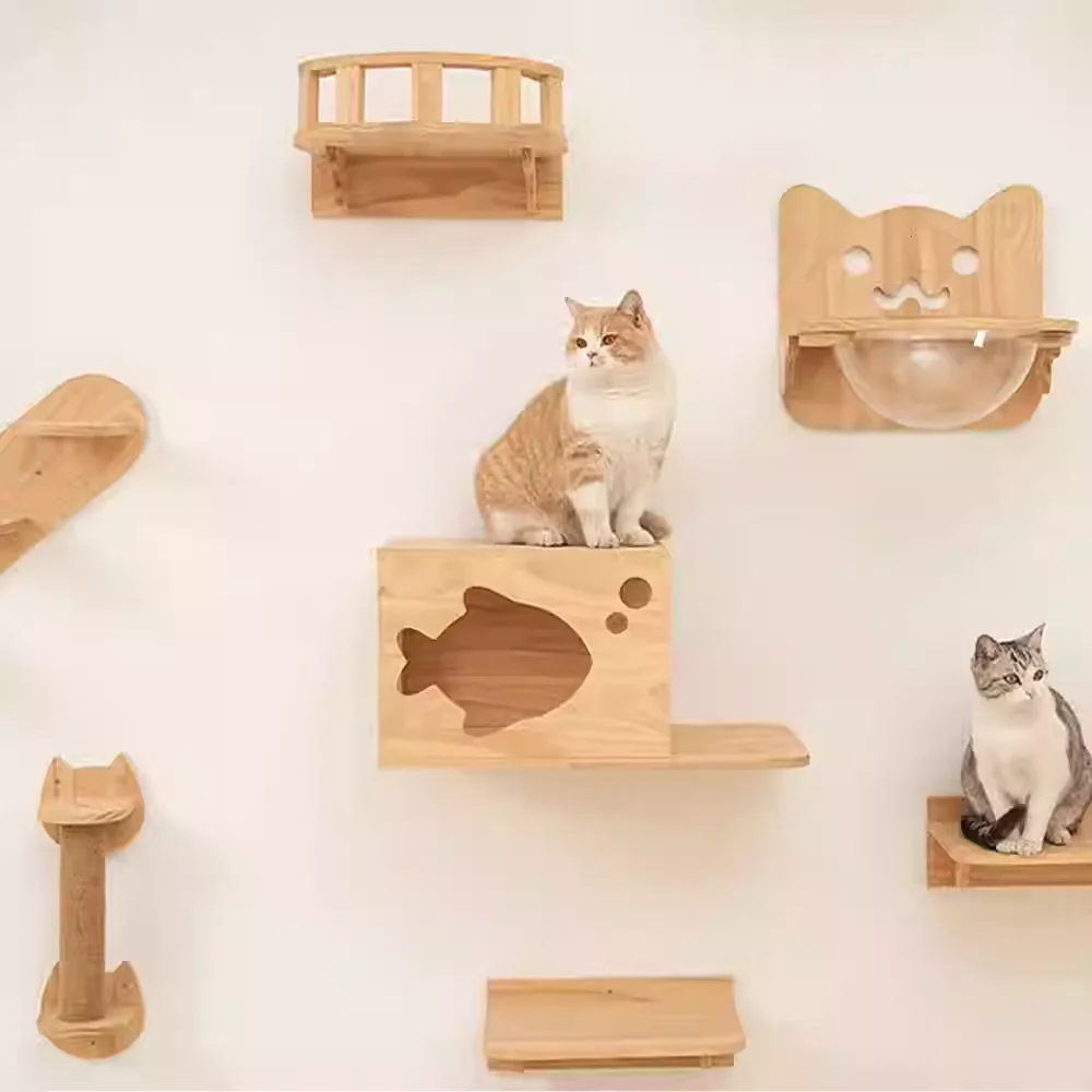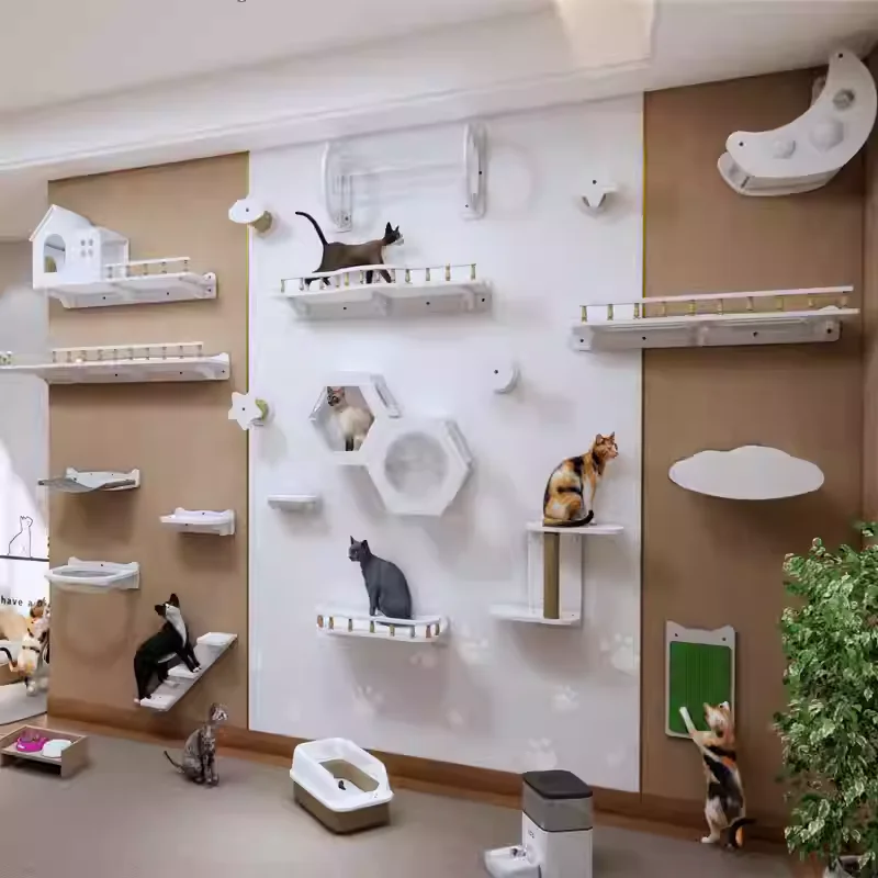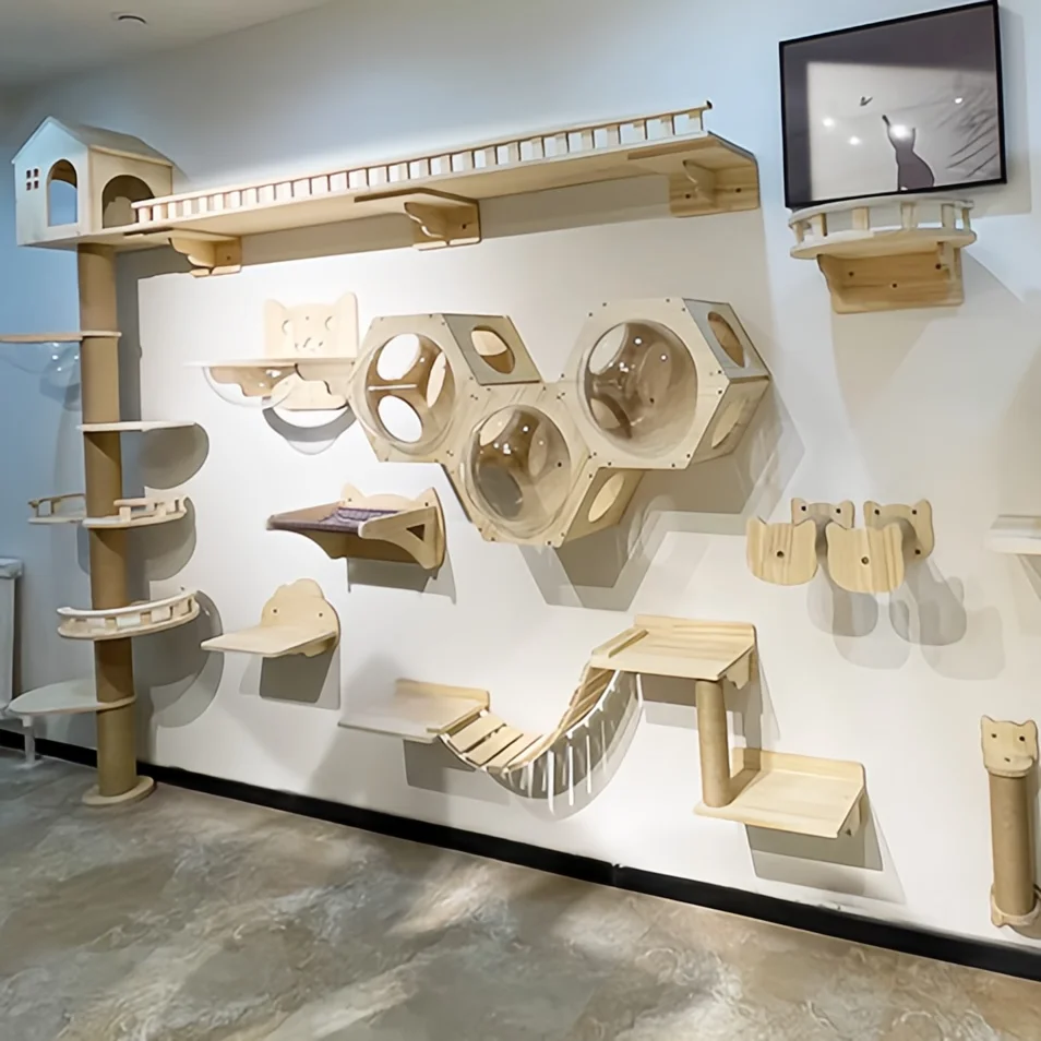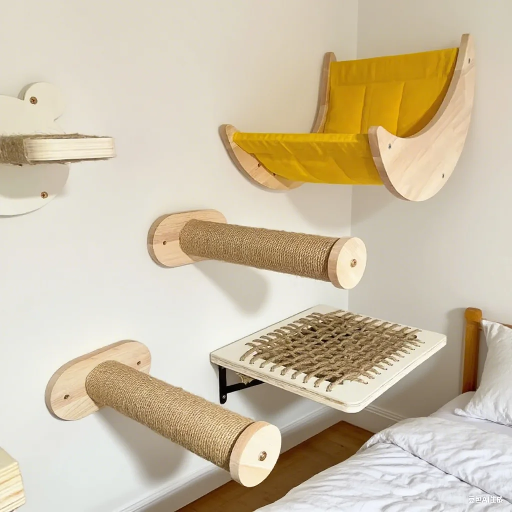 Combina gatos trepar, rascar, descansar y jugar en uno solo.El diseño montado en la pared ahorra espacio en el piso, el poste para rascar satisface las necesidades de rascar y la plataforma de escalada y la hamaca brindan a los gatos diversas actividades y áreas de descanso.