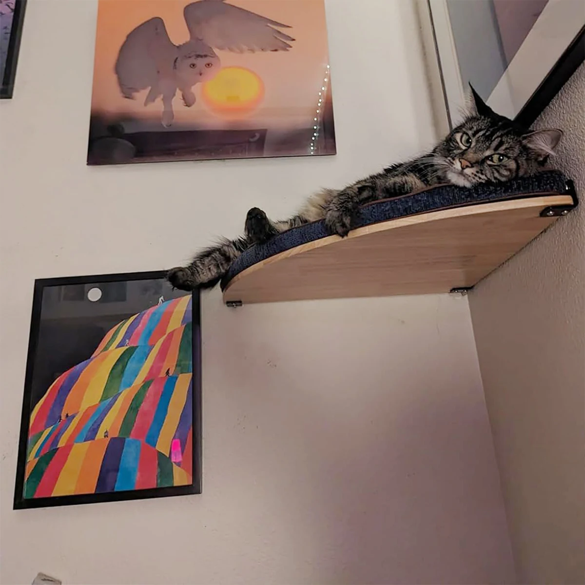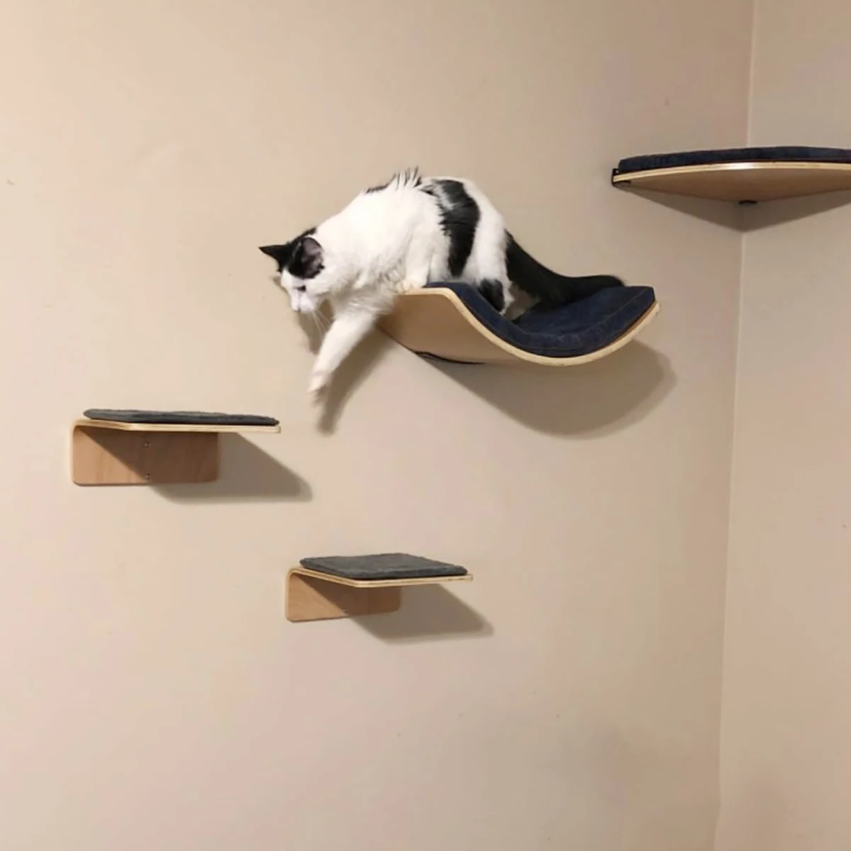 Consta de una cama de pared para gatos en ángulo recto y dos escalones de pared para gatos.El regalo perfecto para mascotas a las que les encanta escalar, adecuado para gatos de hasta 22 libras.Cuenta con tela de fieltro para proteger las patas de tu mascota.
