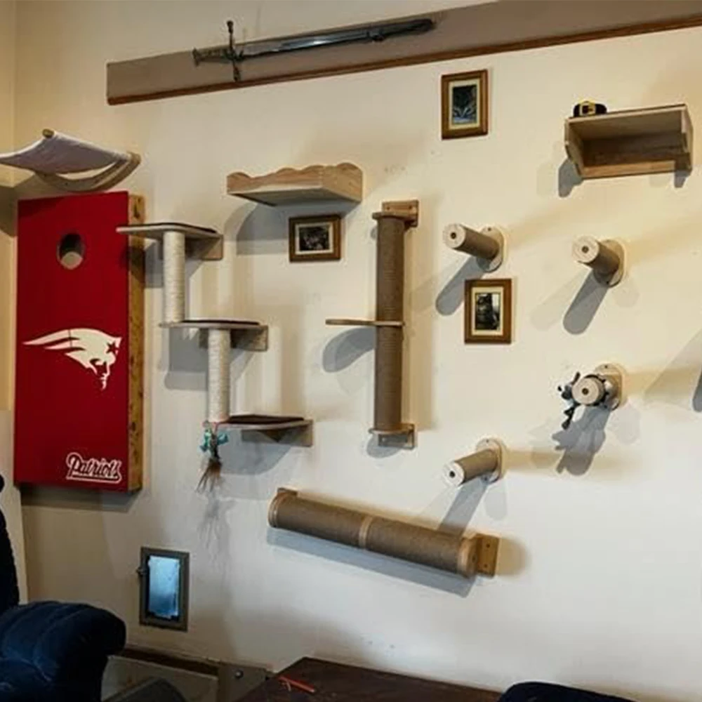 * Juguetes: el dueño puede colocar los juguetes favoritos del gato en la pared del gato y el gato trepará para jugar con el juguete.