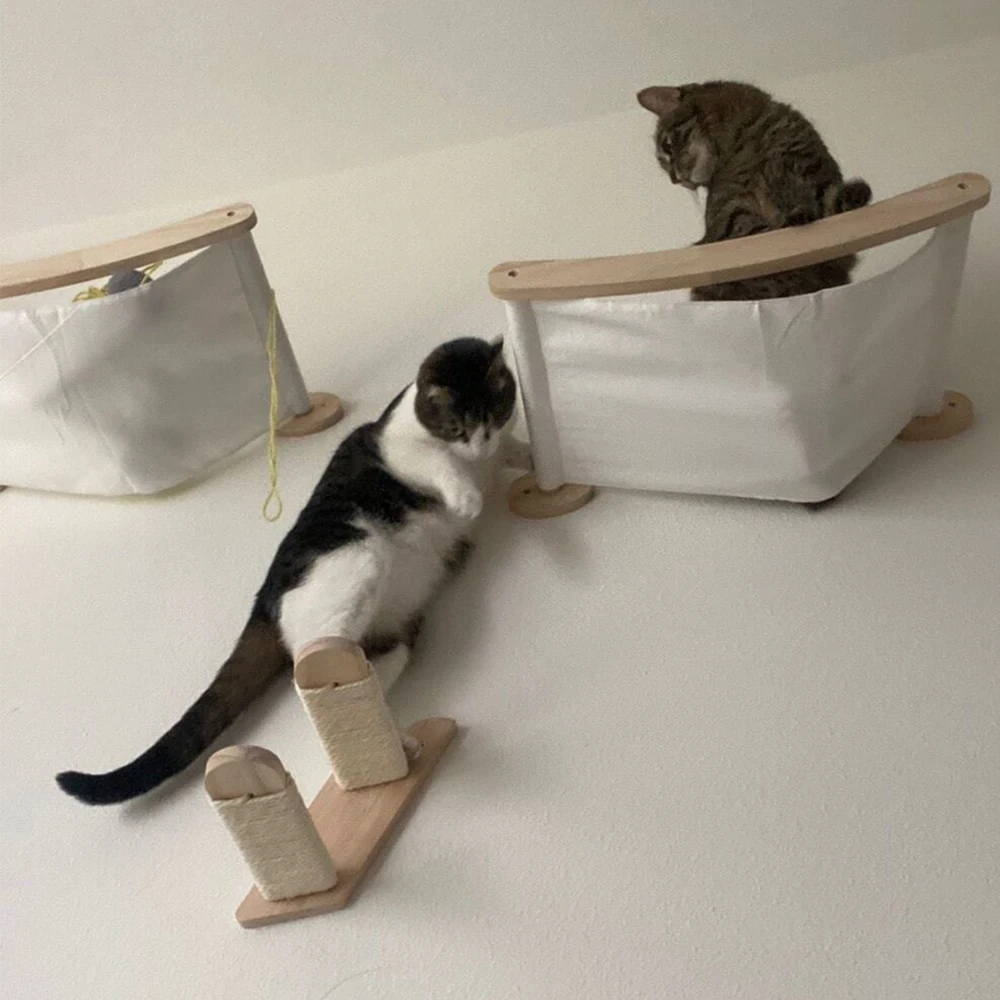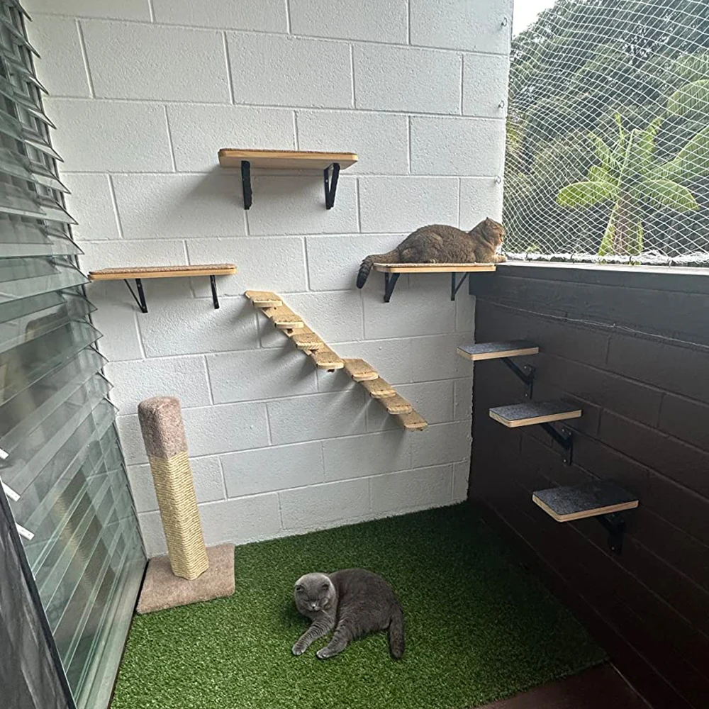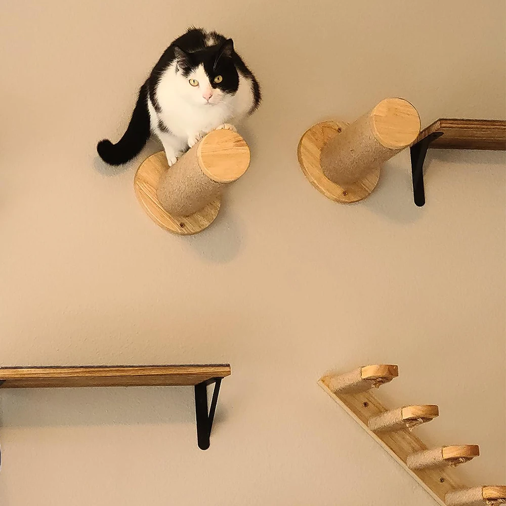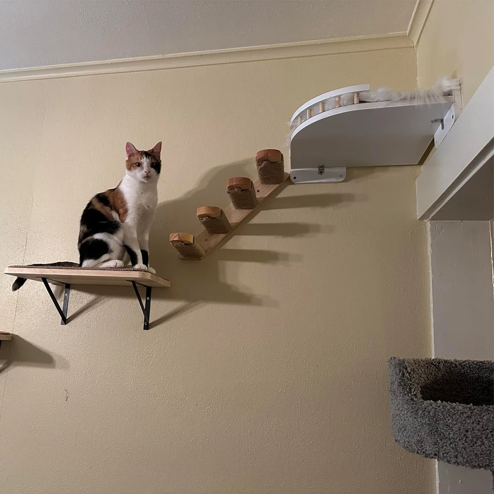 Los estantes de pared para gatos satisfacen el hábito de los gatos de escalar, aumentando el ejercicio y reduciendo la posibilidad de obesidad, lo que es bueno para la salud. Además, le da a los gatos espacio para trepar y evitar estropear el hogar.
