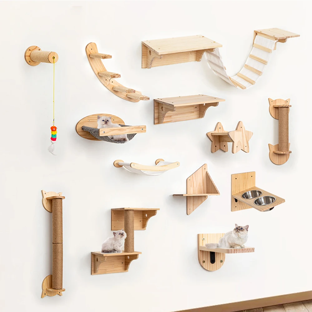 Muebles de pared para gatos de interior con estantes de escalada para hamaca y postes rascadores de sisal para pared, madera maciza montada, ideal para gatitos