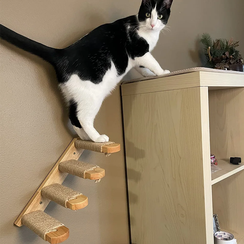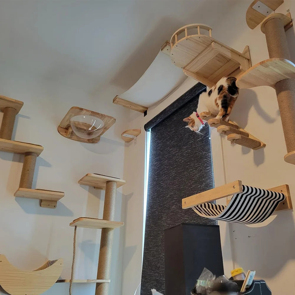 Muebles de interior montados en la pared para gatos con estantes, poste para rascar, plataforma para saltar y escalera de cuerda para hamaca para escalar y relajarse