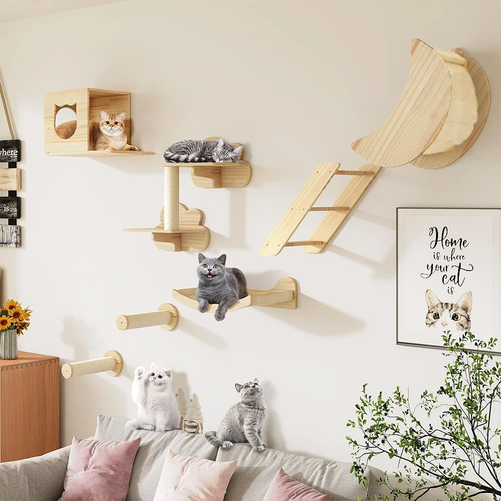 Muebles de pared de madera para gatos, hamacas para gatos, perchas y postes para rascar, estantes de escalada montados en la pared para actividades y relajación de los gatos