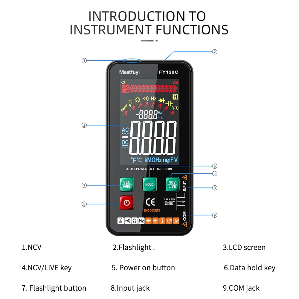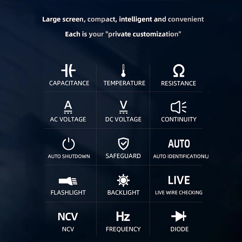 Este instrumento es un multímetro inteligente digital portátil de 5999 recuentos.Tiene las funciones de medición rápida de datos, pantalla doble LCD grande, lámpara de iluminación, fácil lectura para los usuarios, protección overId e indicación de voltaje insuficiente de la batería. Ya sea que lo utilice profesionales, fábricas, escuelas, amantes o familias, es un instrumento multifuncional ideal.