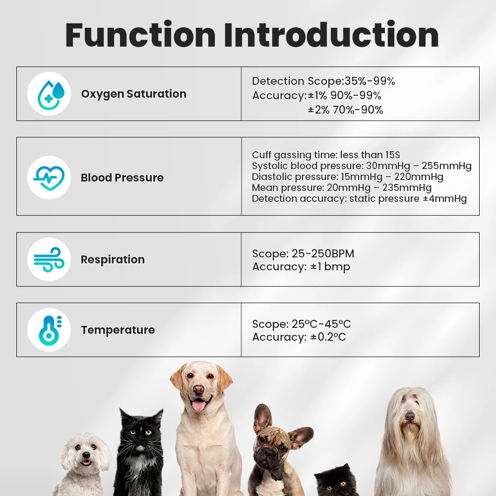Aplicación: Puede ser ampliamente utilizado en el monitoreo familiar de la salud de las mascotas, instituciones médicas para mascotas, clínicas veterinarias y exámenes y monitoreo quirúrgico de la salud de los animales pequeños.
