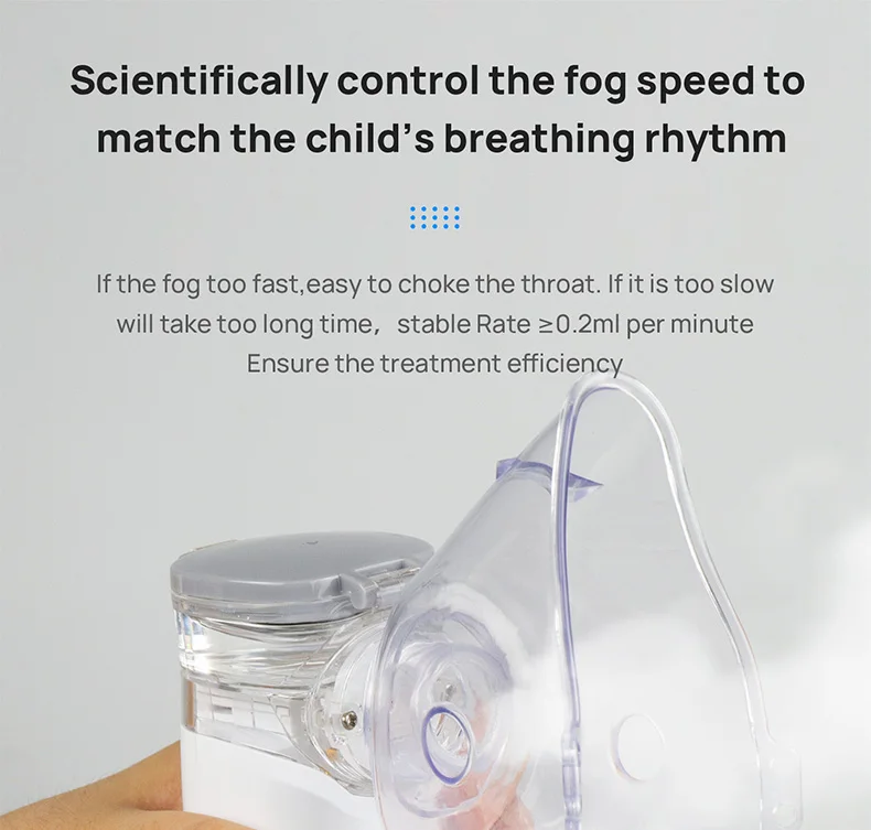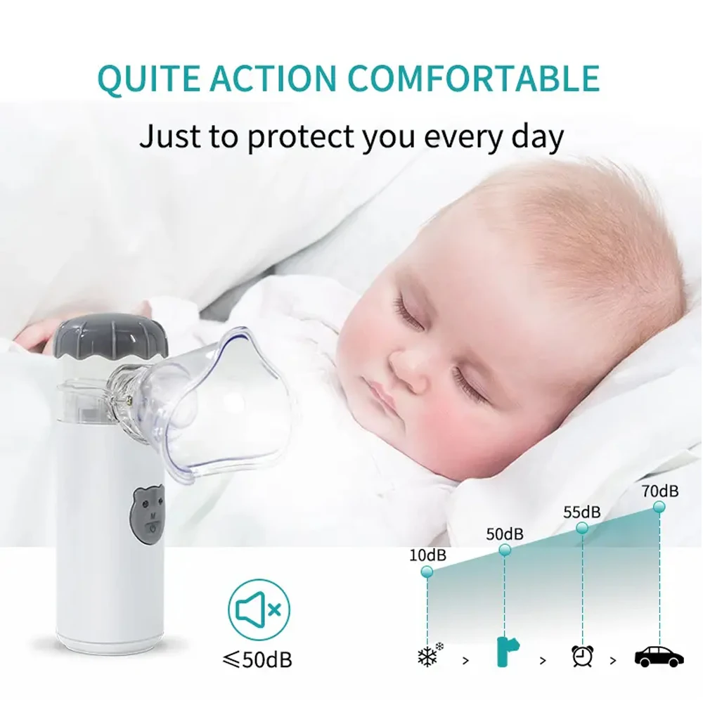 Pequeño en volumen, liviano, fácil de operar, seguro y silencioso de usar.El sonido del nebulizador es de 0 a 50 decibelios, lo que puede hacerte sentir tranquilo y disfrutar de tu cómodo tratamiento.