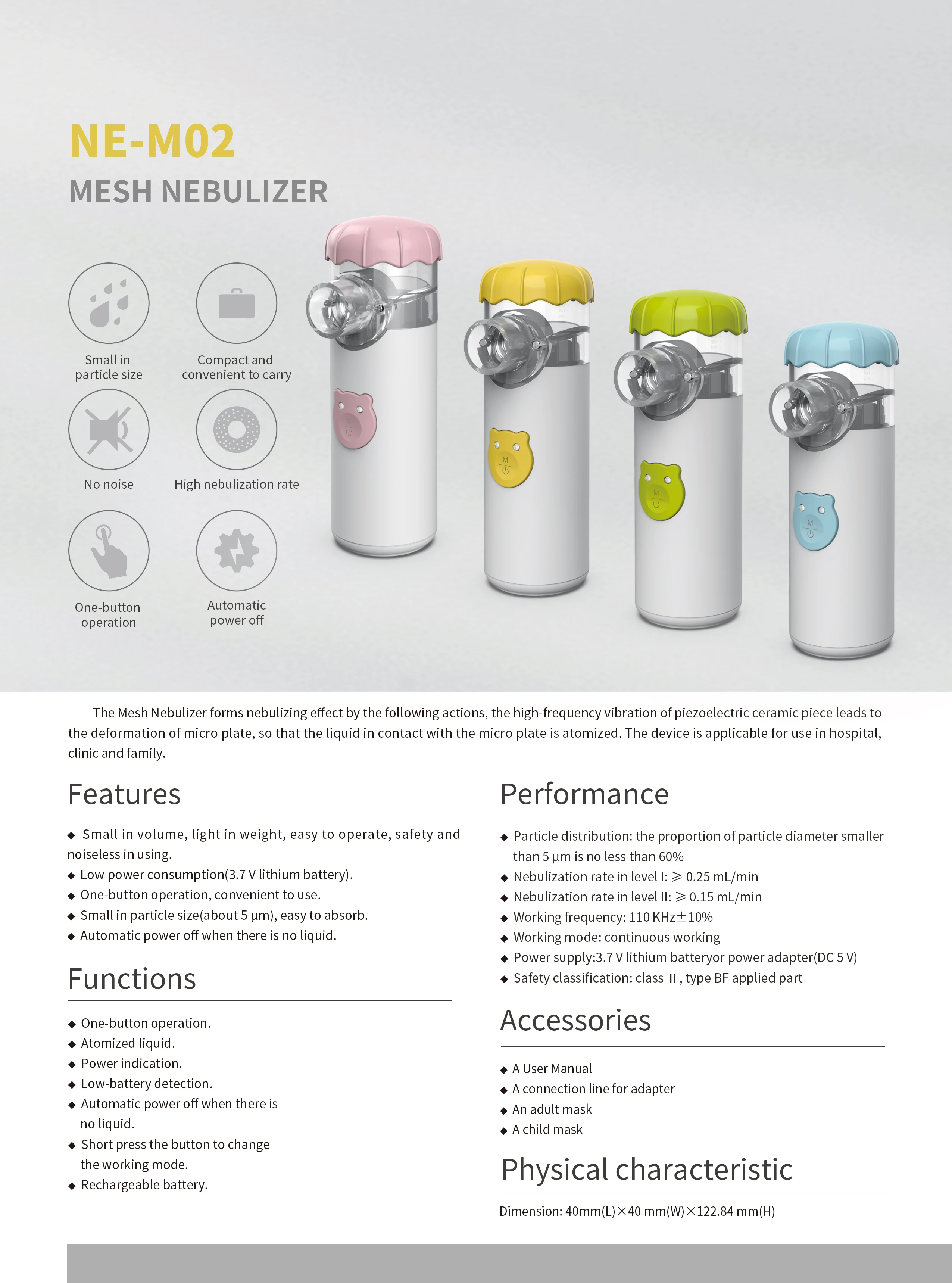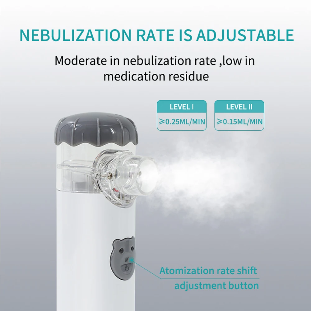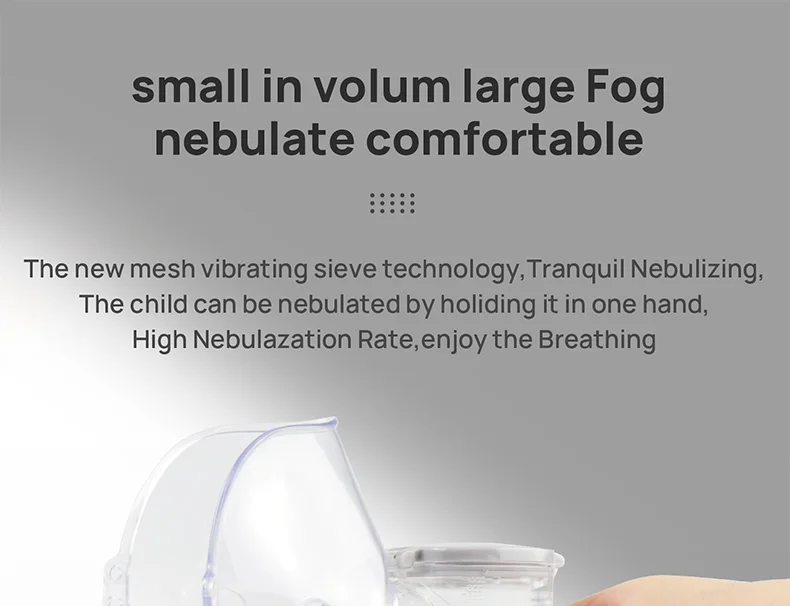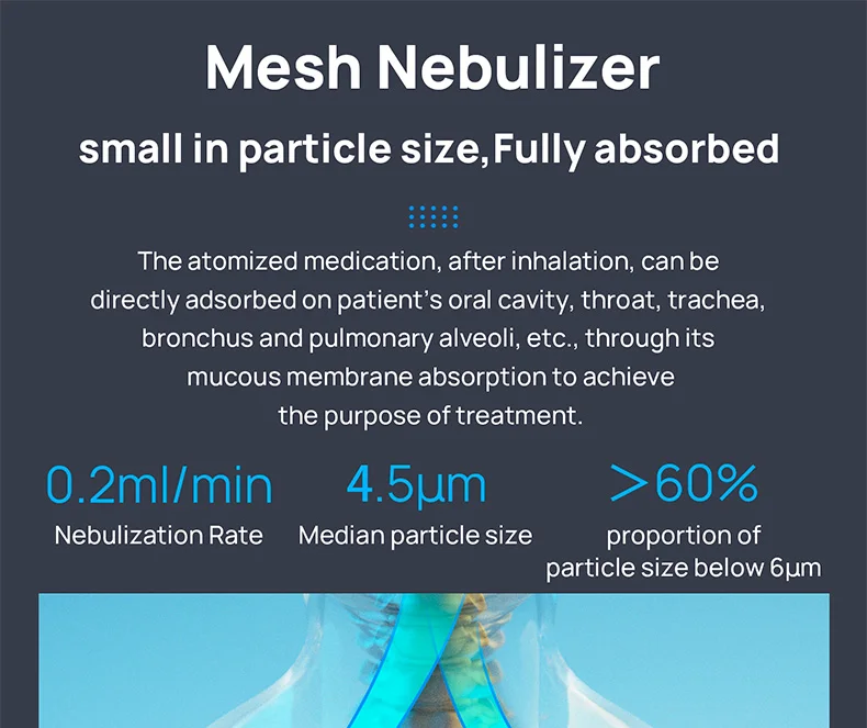 Pequeño en tamaño de partícula (aproximadamente 5 μm), fácil de absorber.El inhalador adopta la tecnología de atomización de micromalla MINI AIR 360+.Las partículas uniformes favorecen más la absorción de las personas mayores.La partícula atomizada promedio es de 2,5 p. m., 0,2 ml por minuto, lo que ayuda a tratar eficazmente enfermedades respiratorias específicas.La solución de inhalación se puede atomizar completamente con el dispositivo.