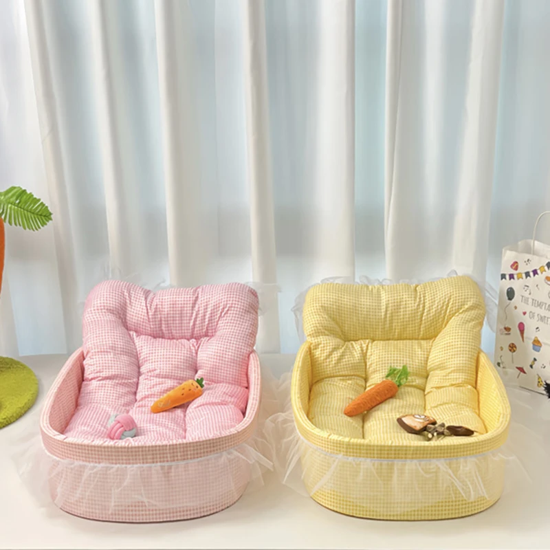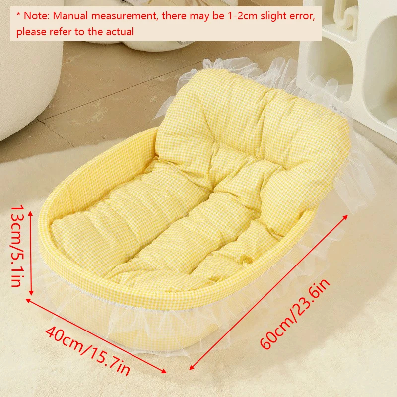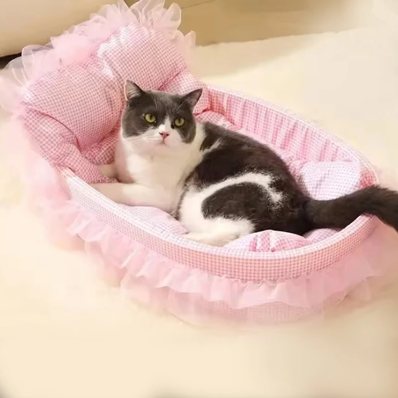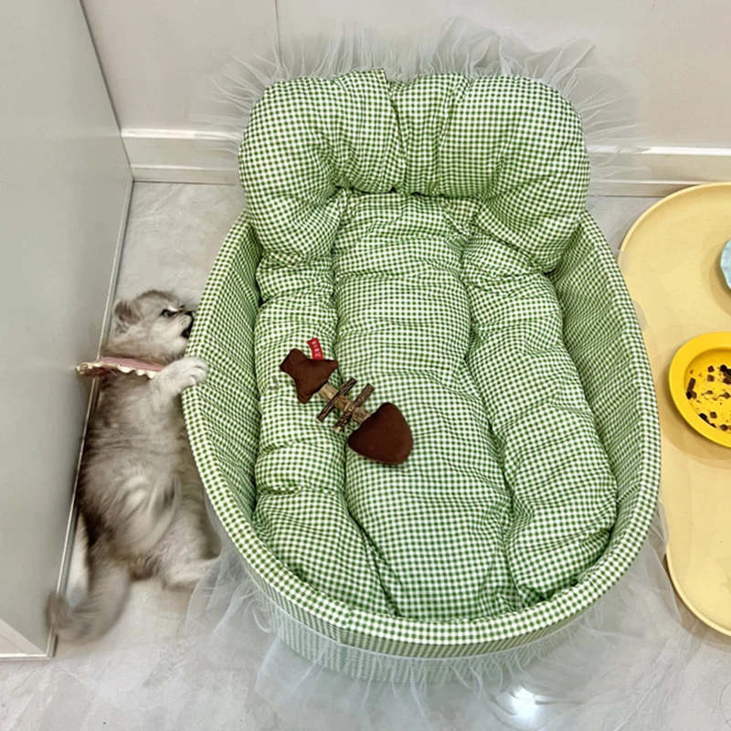 El cuerpo de la cama está diseñado como un estilo de cama de princesa, colores suaves (como azul, rosa, morado y otros colores), con tela a cuadros y falda de malla romántica, para satisfacer el valor de búsqueda del dueño de la mascota de suministros.