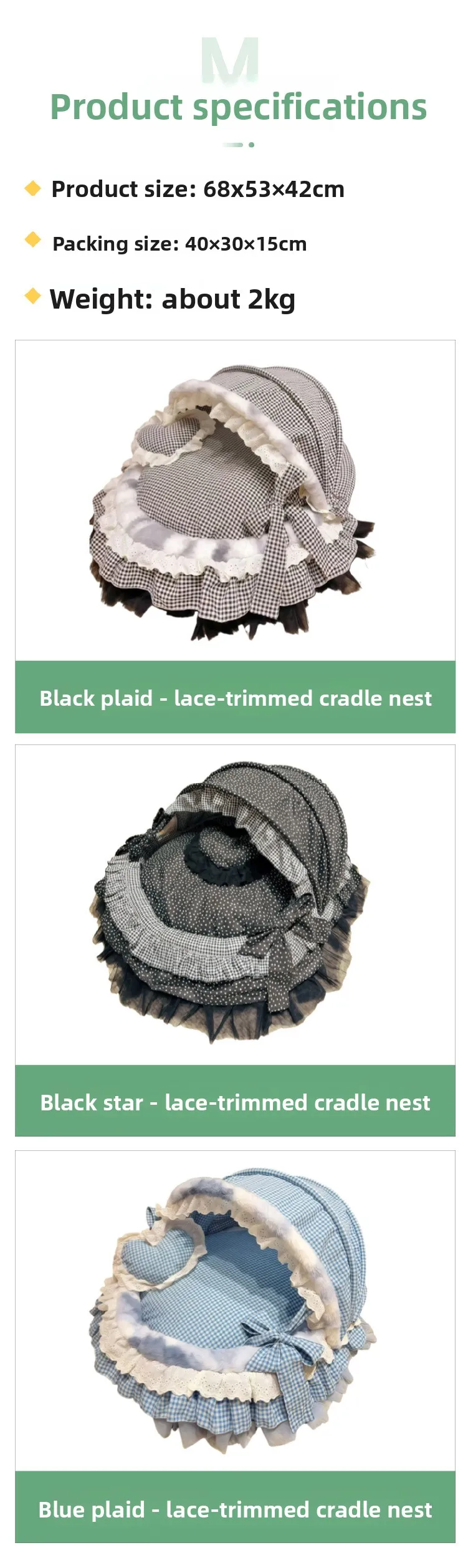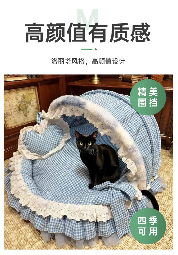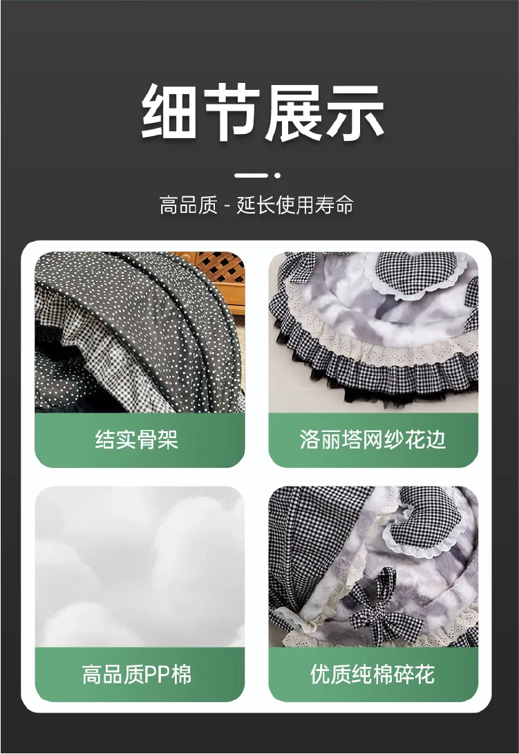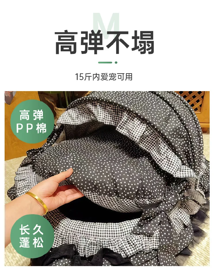 3: Encaje:Con encaje de malla Lolita de alta gama de algodón puro, el hilo de malla es ligero y transparente pero no es fácil enganchar la seda.El material del hilo de algodón es suave y sin espinas, y el diseño plisado estilo Lolita es romántico y delicado, lo que no solo mejora la apariencia general del nido del gato, sino que tampoco permite engancharlo al jugar.