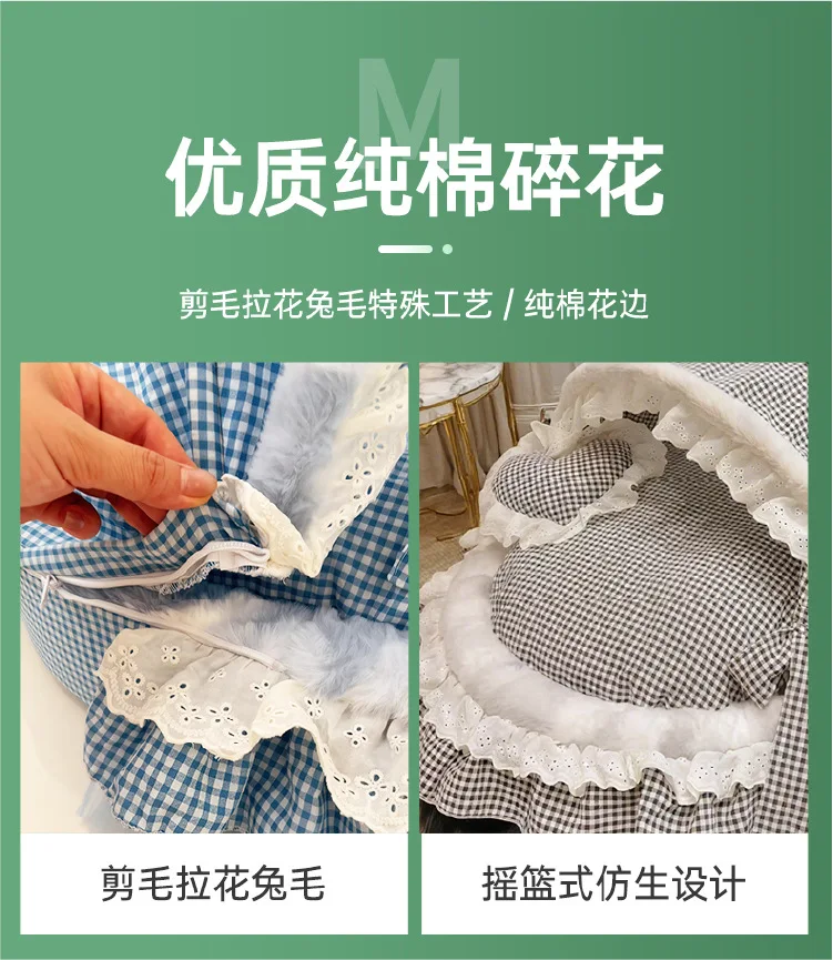 2: Letrera para gatos:El proceso especial de cortar y tirar del pelo de conejo se utiliza para crear la superficie del nido.La textura del pelo de conejo es esponjosa y delicada, y es suave al tacto como una nube.La textura de la flor de café con leche es exquisita y tridimensional, y tiene un toque ligero y lujoso.El borde está punteado con encaje de algodón puro, y el cosido a mano es firme y no se decolora.Los detalles son exquisitos, creando una experiencia cómoda para el gato "si pisas, no querrás mover el nido";