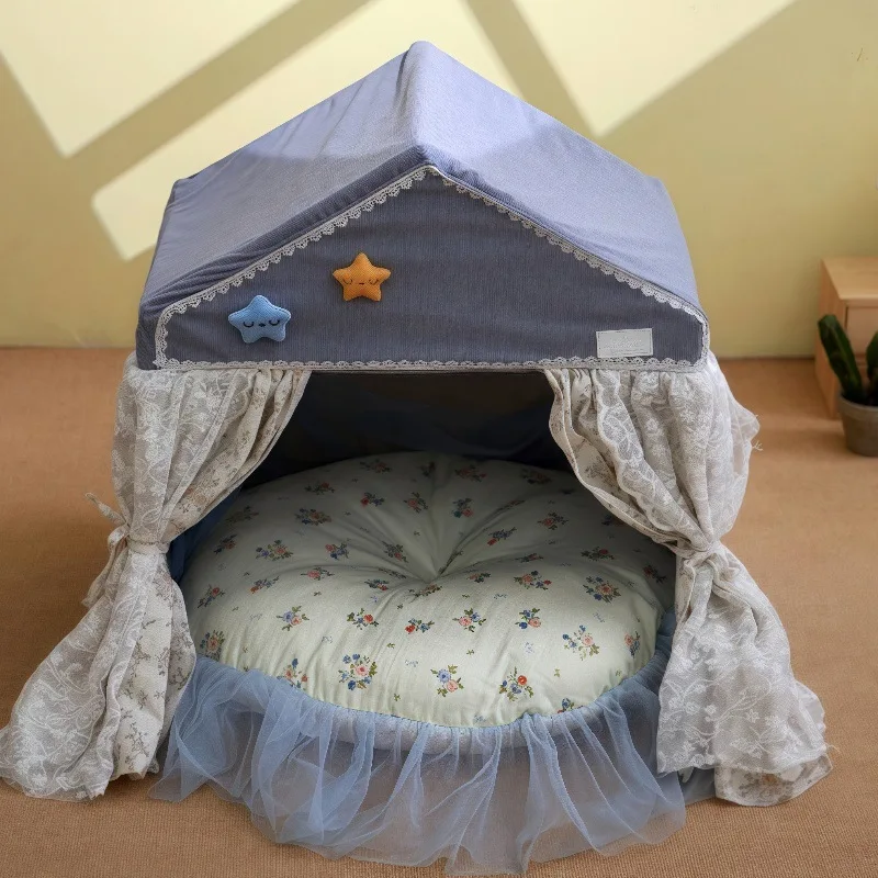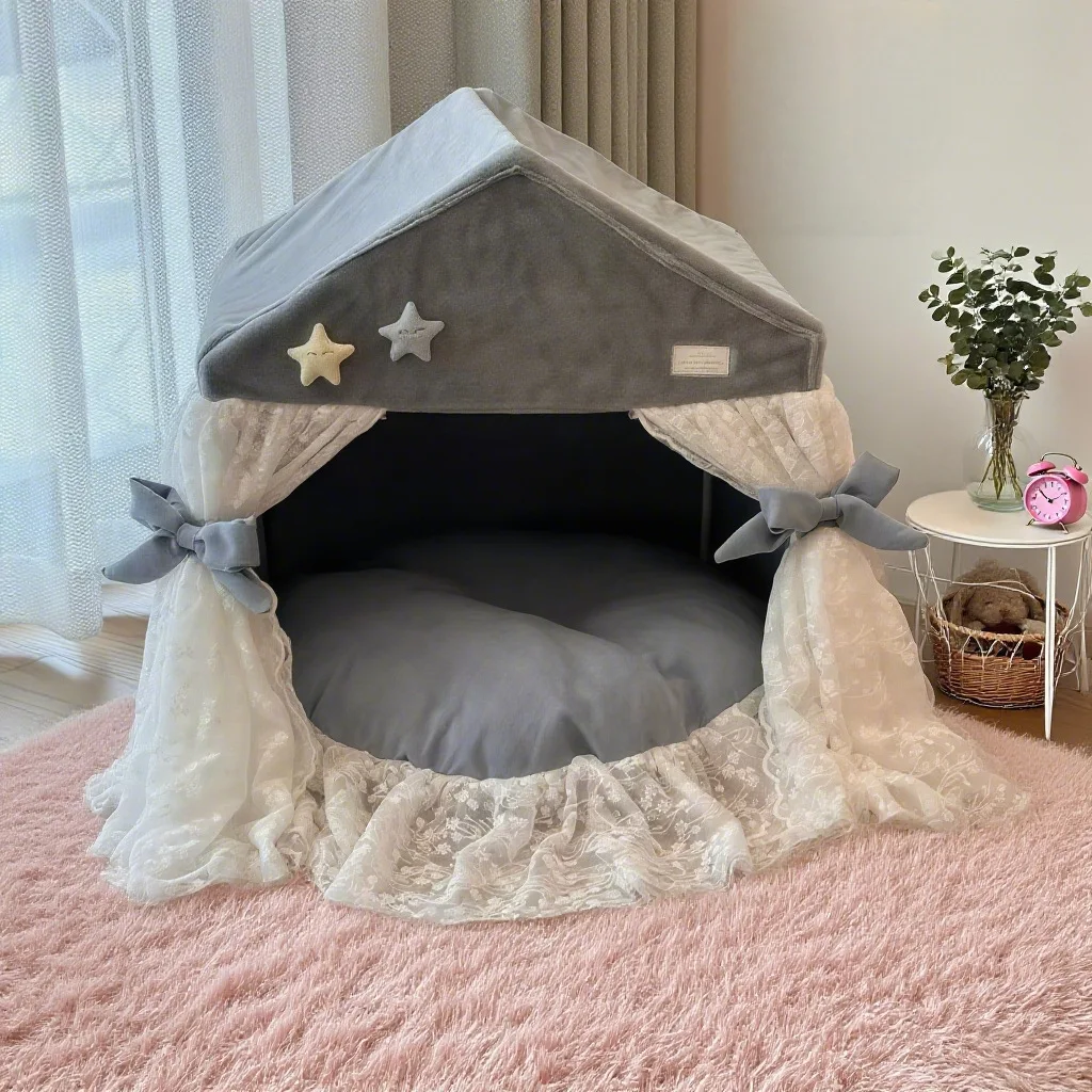 Nido de tienda para mascotas semicerrado con estilo, nido creativo de felpa para perros y gatos, cama de princesa de encaje para mascotas, suministros para gatos