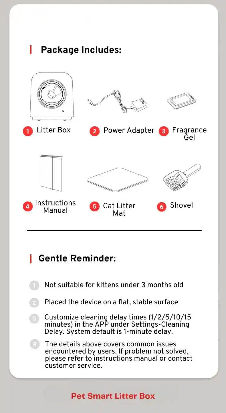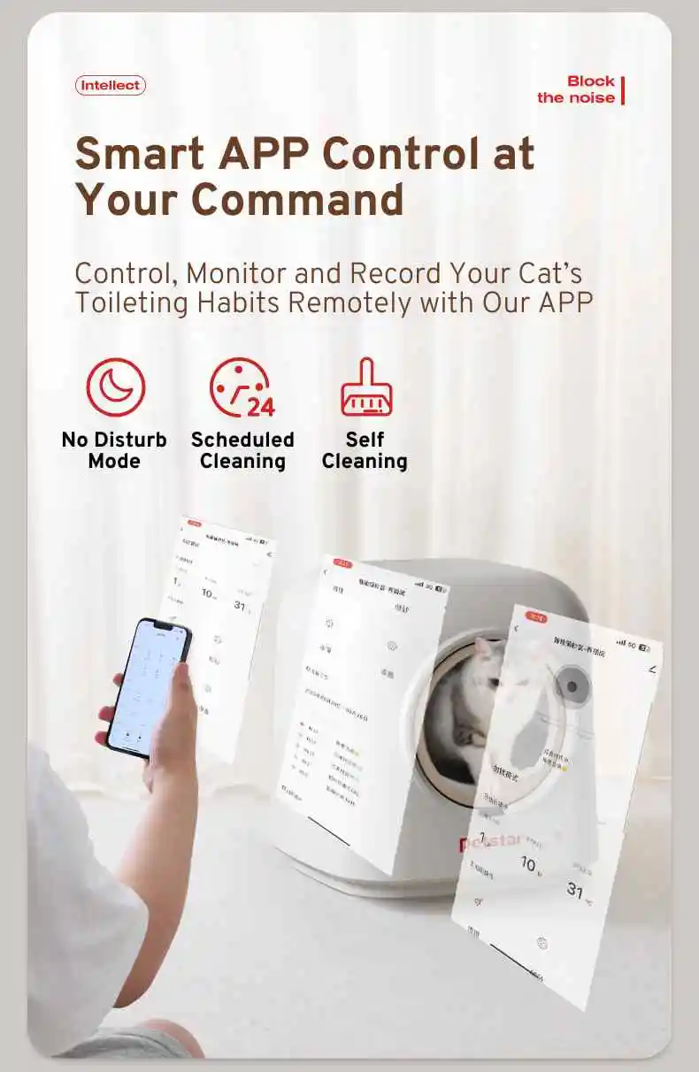 * Control inteligente de aplicaciones: controle el uso de la caja de arena de su gato, establezca horarios de limpieza y obtenga informes de actividad a través de la aplicación