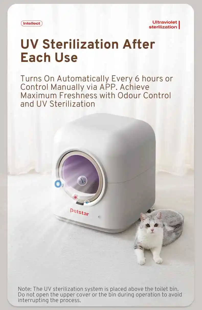 * Sistema de autolimpieza automática: la caja de arena se limpia automáticamente después de cada uso, lo que garantiza una experiencia sin complicaciones para usted y su gato.