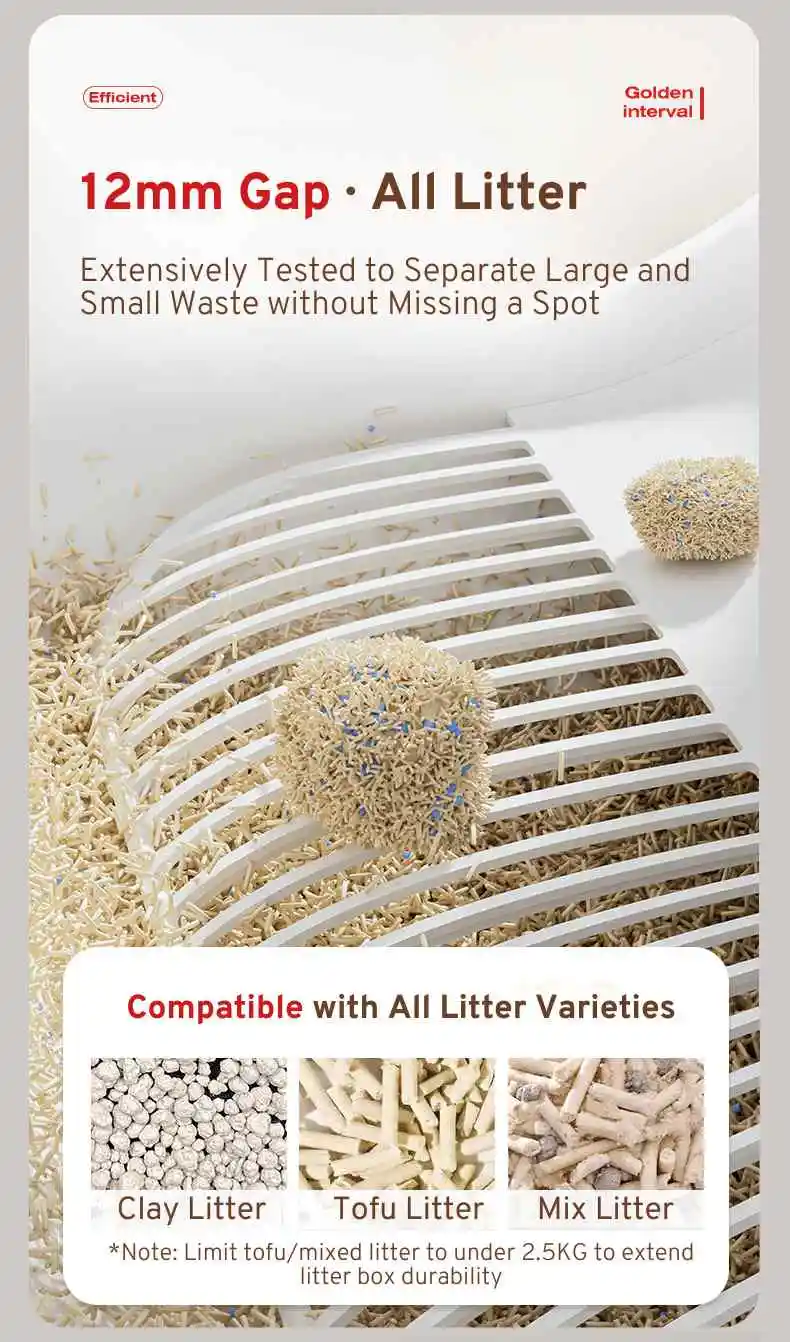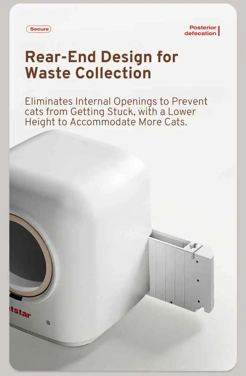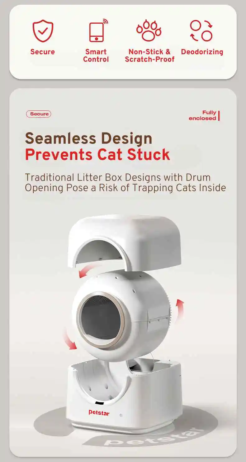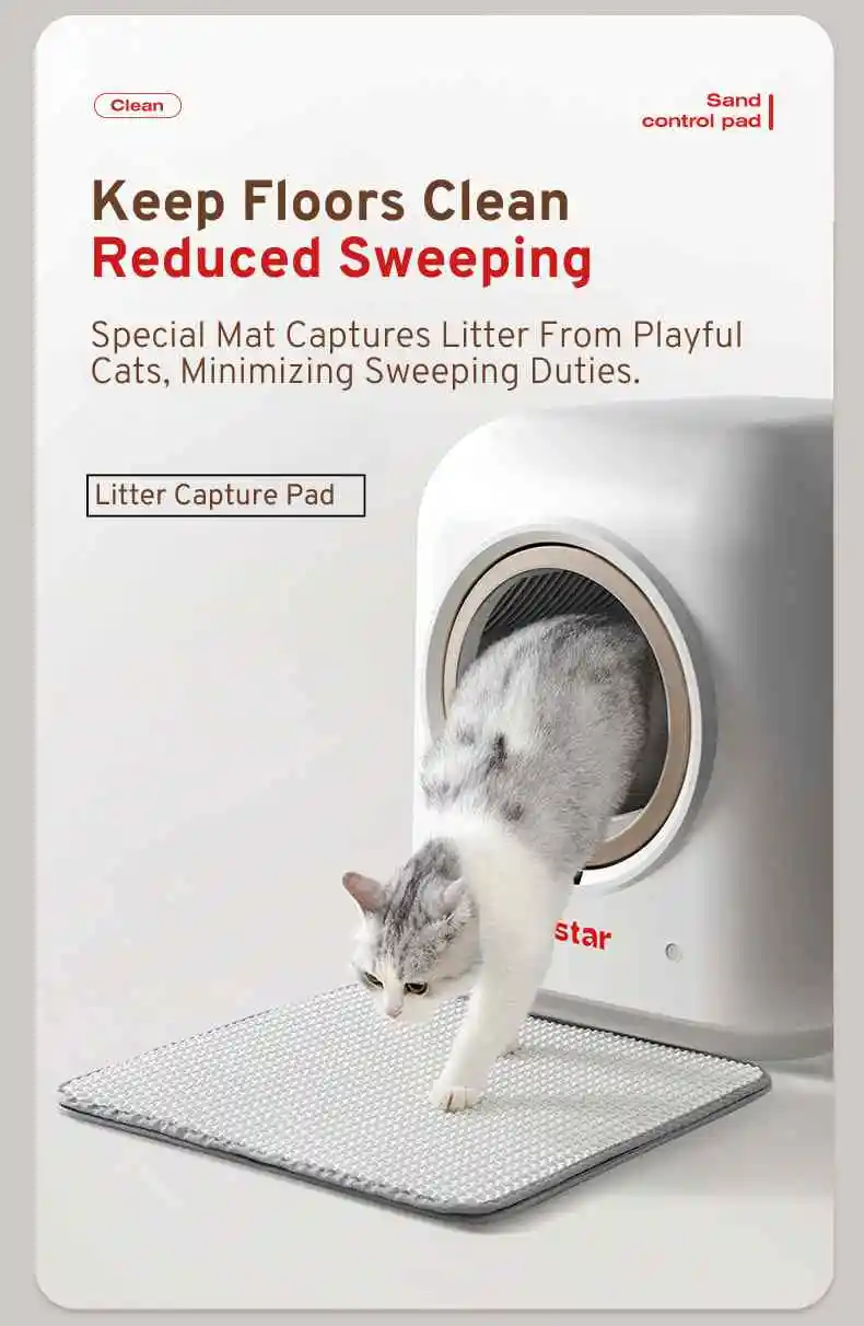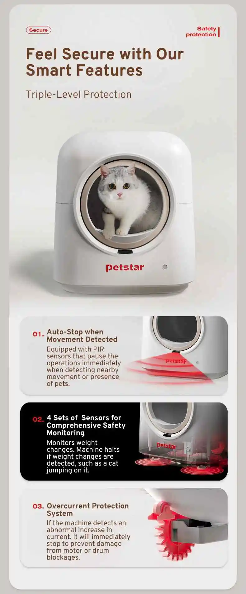 * Seguro para gatos: Equipado con múltiples funciones de seguridad, que incluyen escotilla de seguridad antipellizco y sensores de gravedad que detienen el