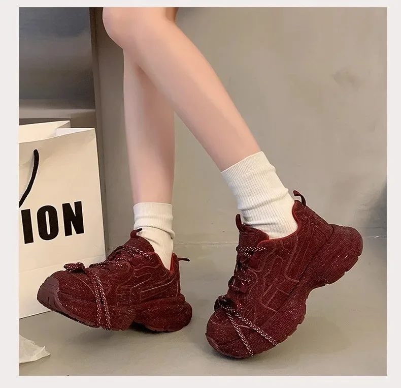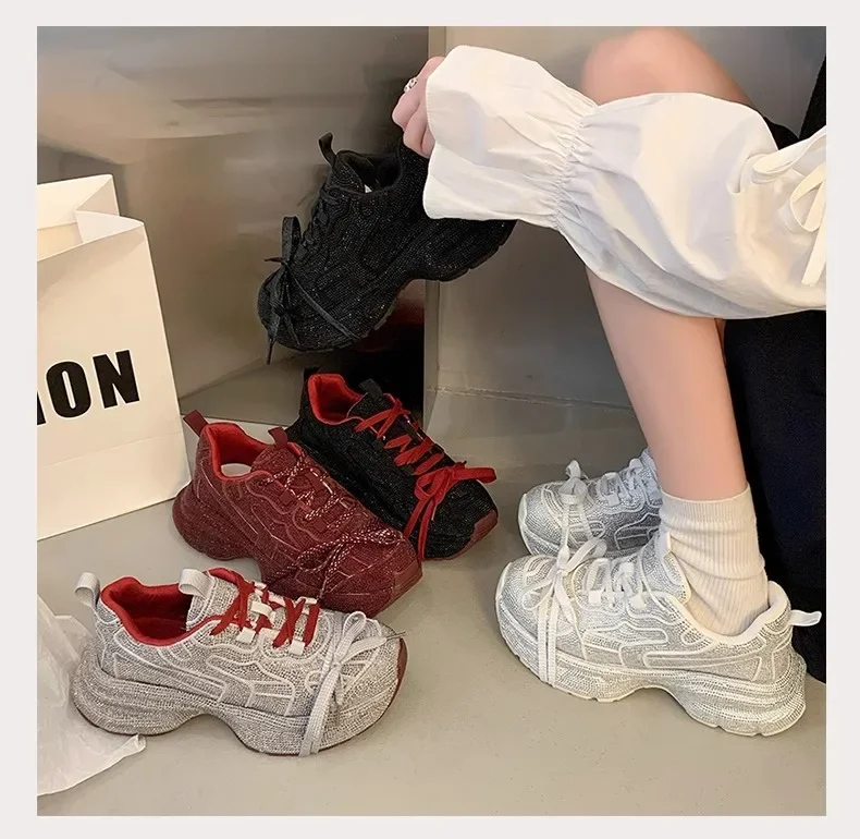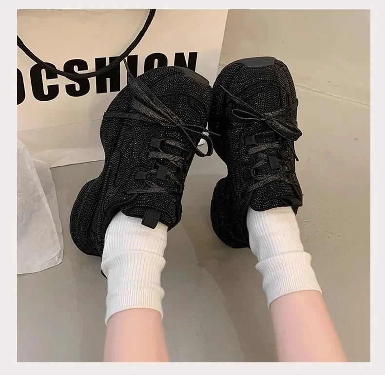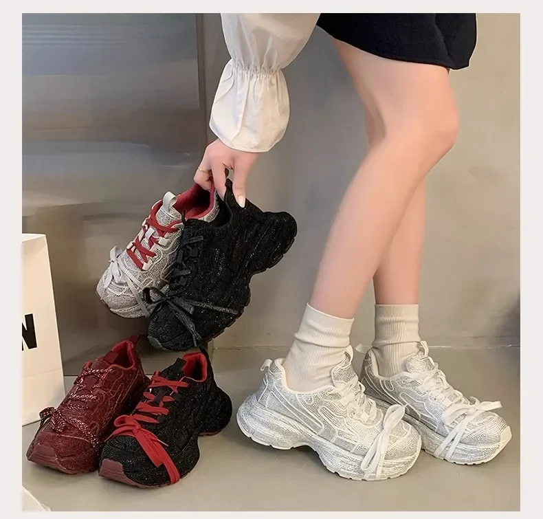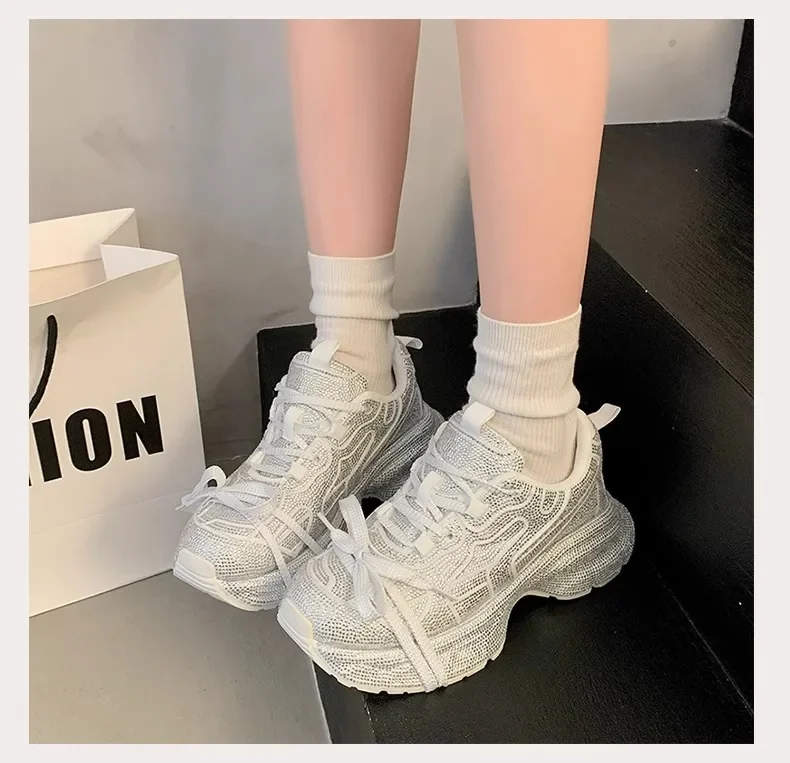 Nuevo 2025 zapatos de papá para mujer, zapatos deportivos informales con parte inferior gruesa y diamantes de imitación brillantes, zapatos de verano con parte inferior de goma en el tobillo