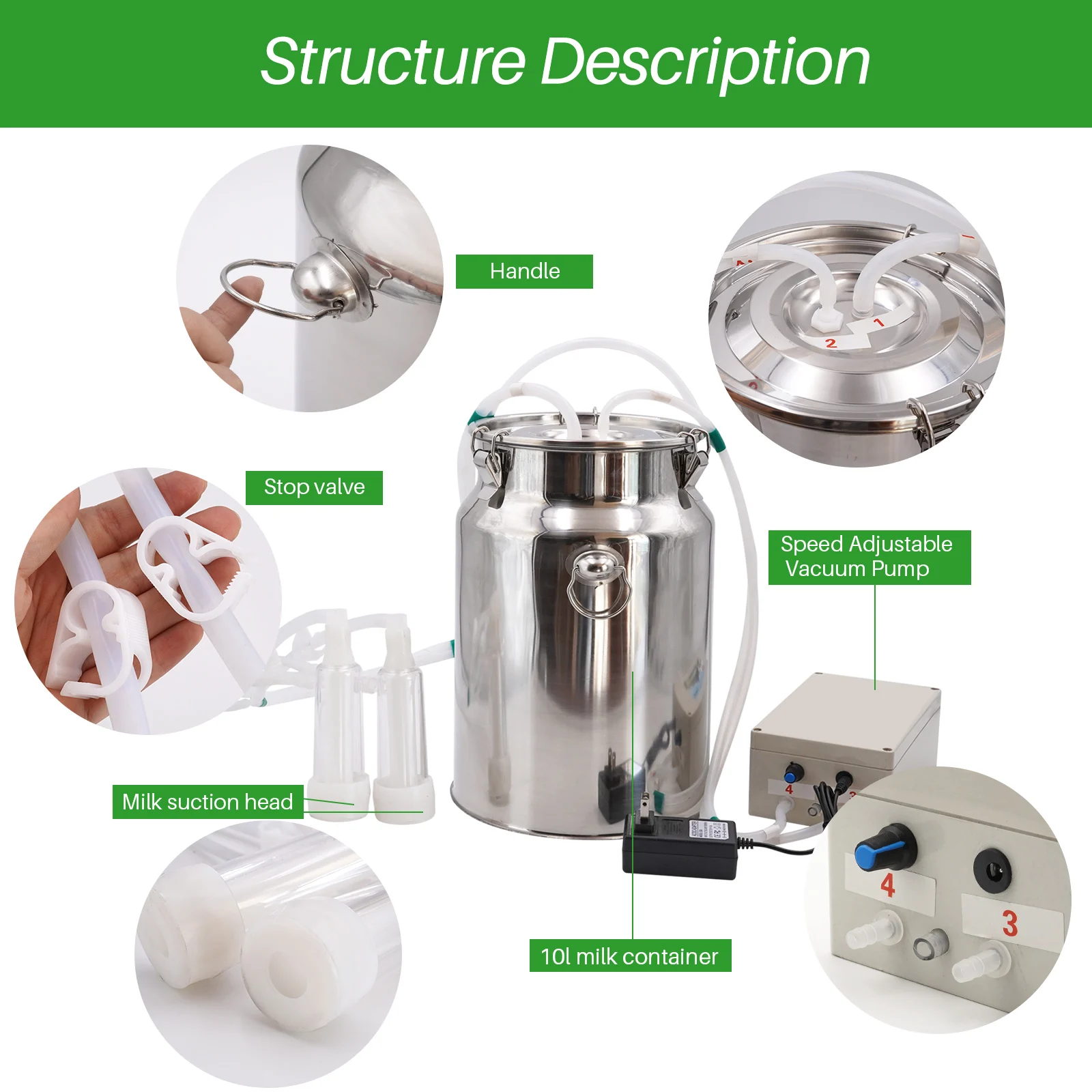 Ordeñadora eléctrica de cabra de 10L, ordeñadora pulsante de ganado de 220V, ordeñadora de acero inoxidable, Cubo de ordeño, bomba de vacío, información: