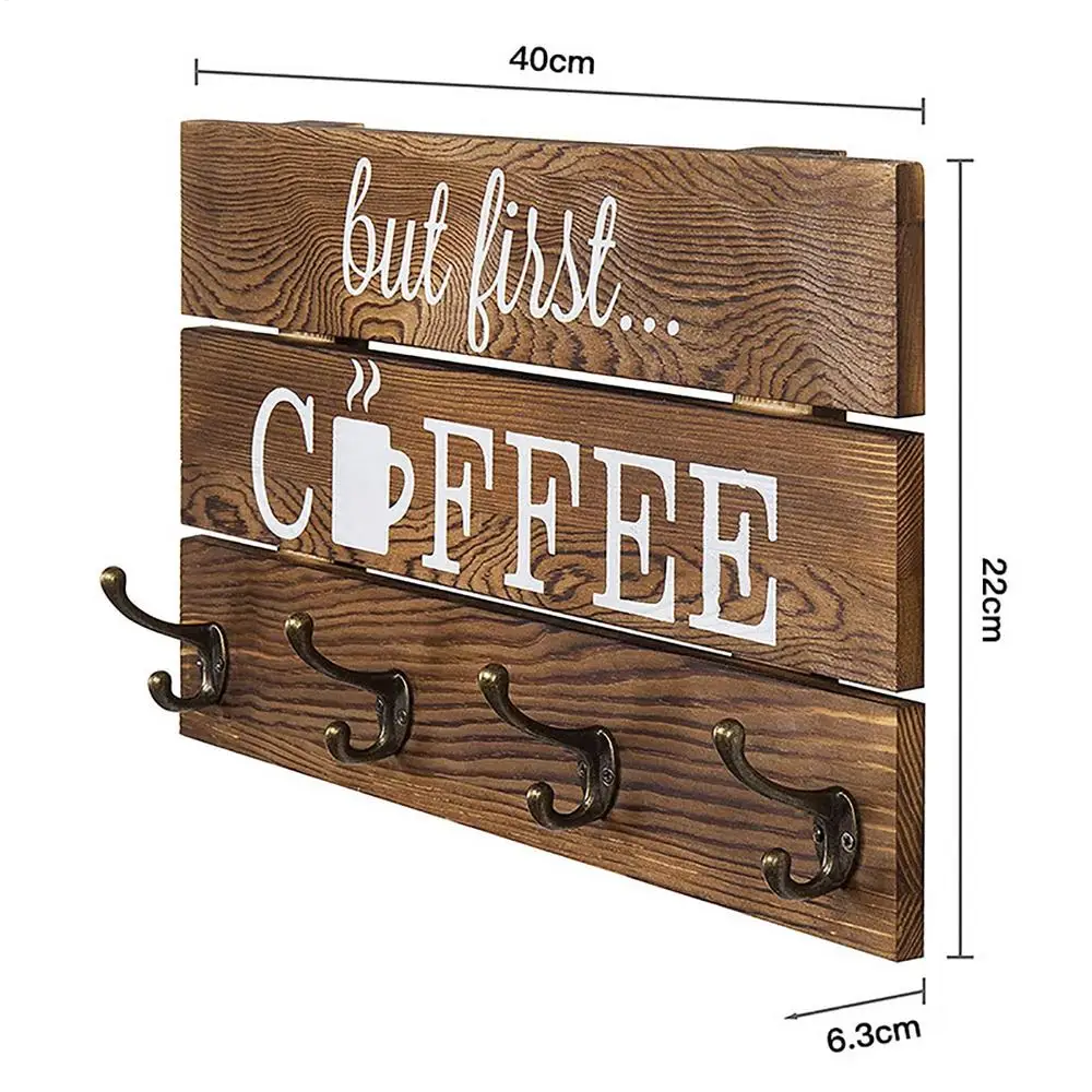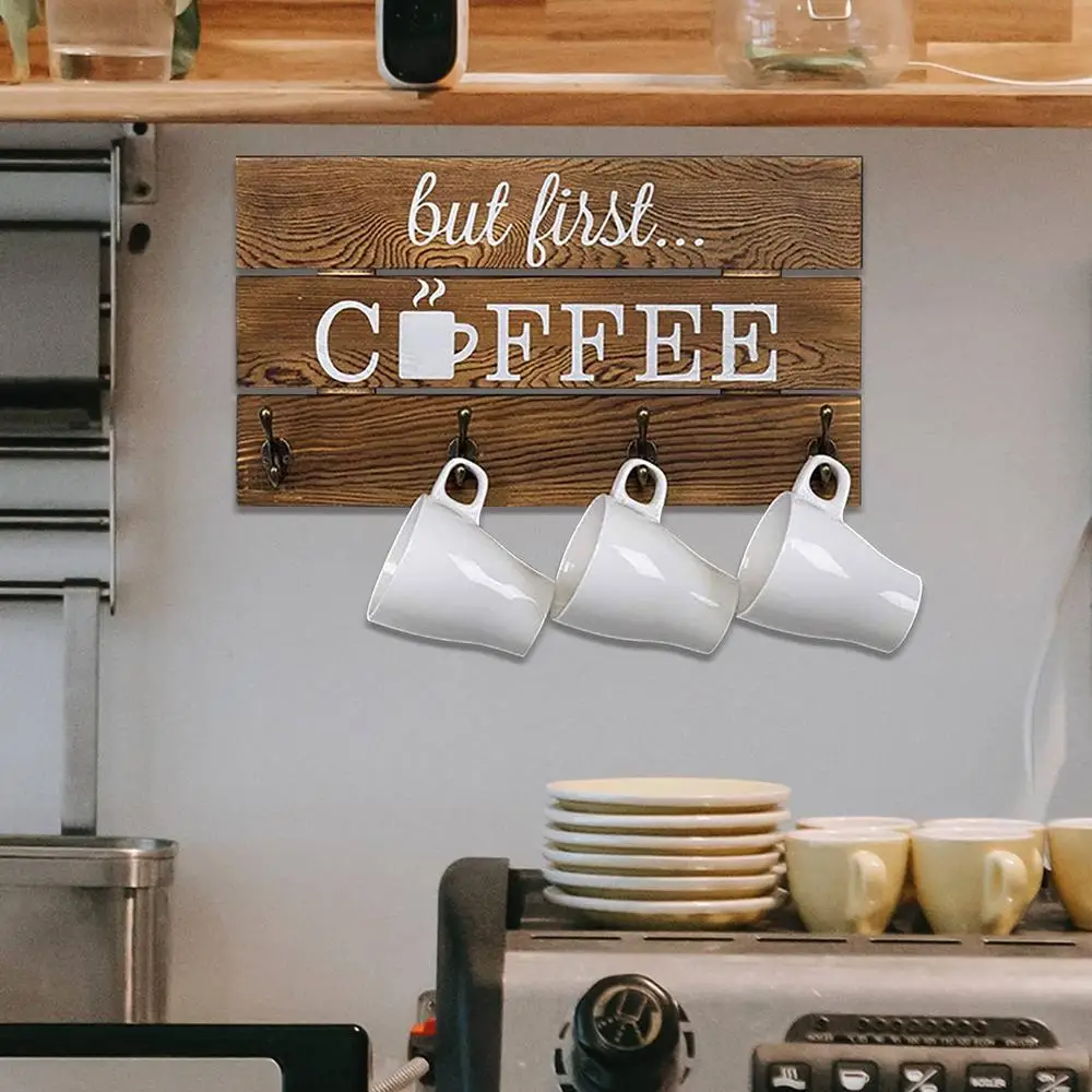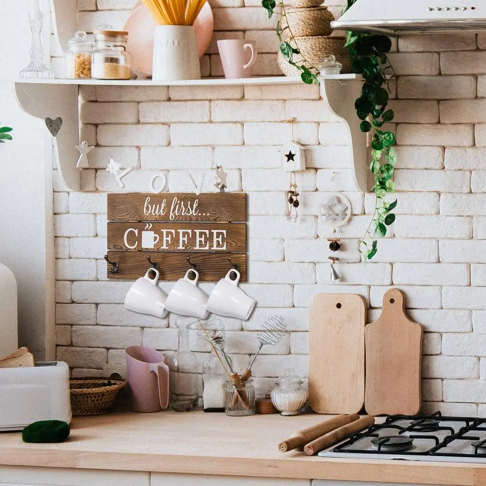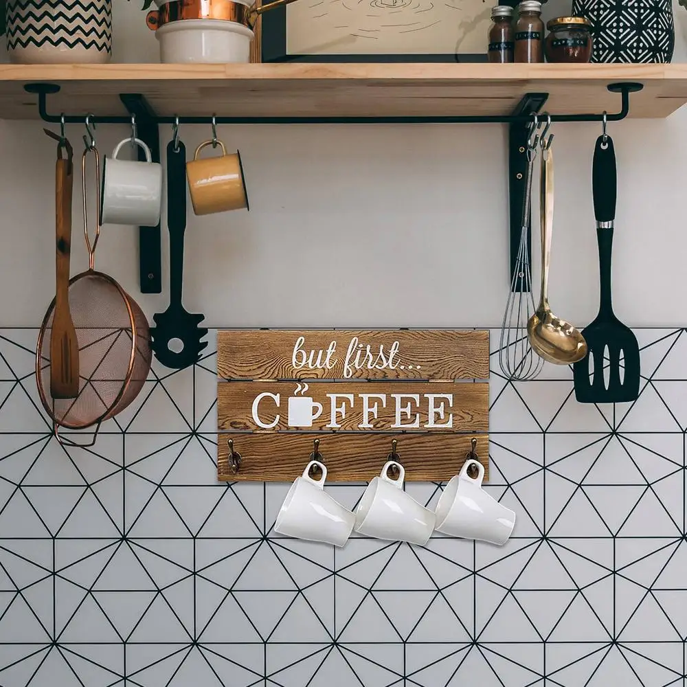 2. Ganchos estables: este estante de madera para tazas de café montado en la pared está grabado con letras, se puede colgar fácilmente en la pared y no es fácil de quitar, es muy adecuado como decoración.