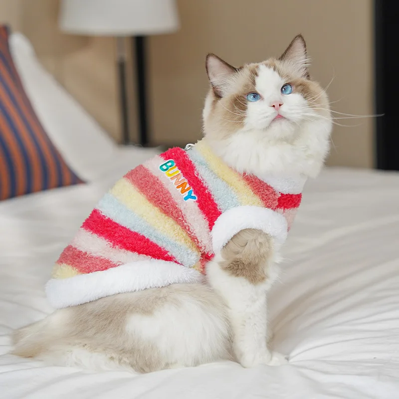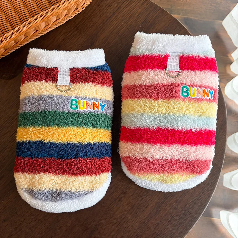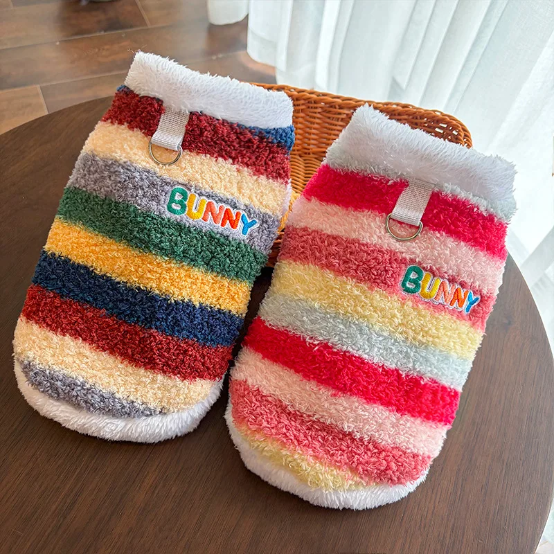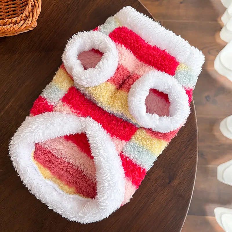 Otoño/Invierno, abrigo a rayas de arcoíris de felpa para mascotas, camiseta sin mangas de felpa para gatos, ropa para cachorros, ropa para perros pequeños