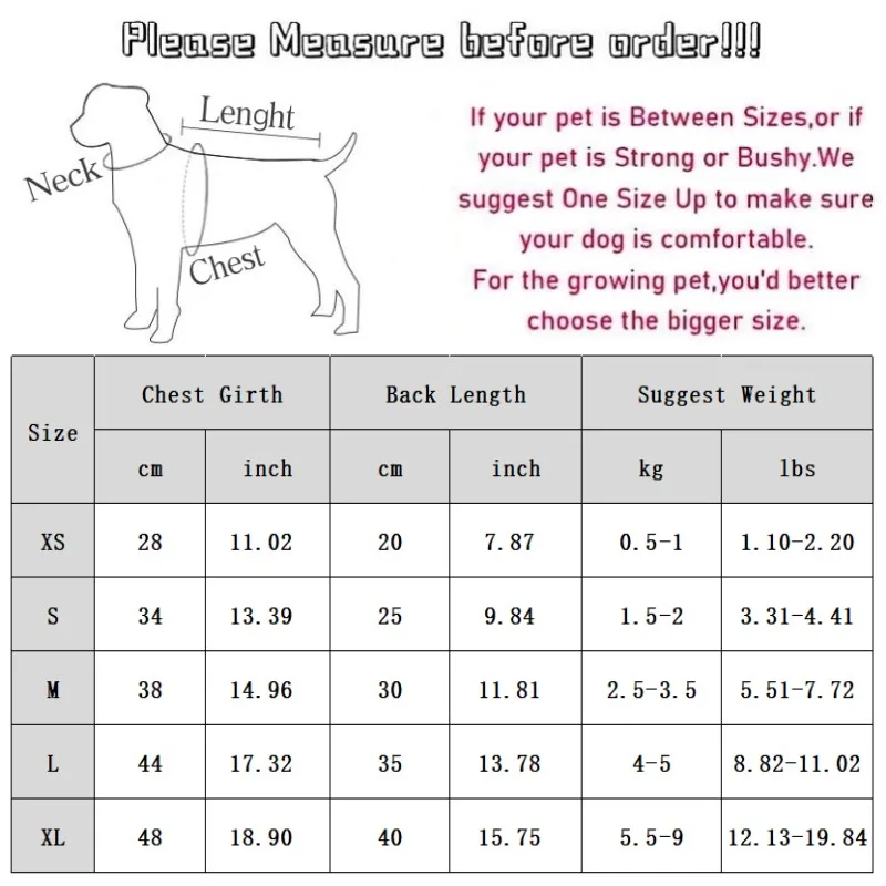 XL: Pecho 48 cm/18,9 ''; Longitud 40 cm/15,75 ''; Peso sugerido 5,5-9 kg/12,13-19,84 lbs.