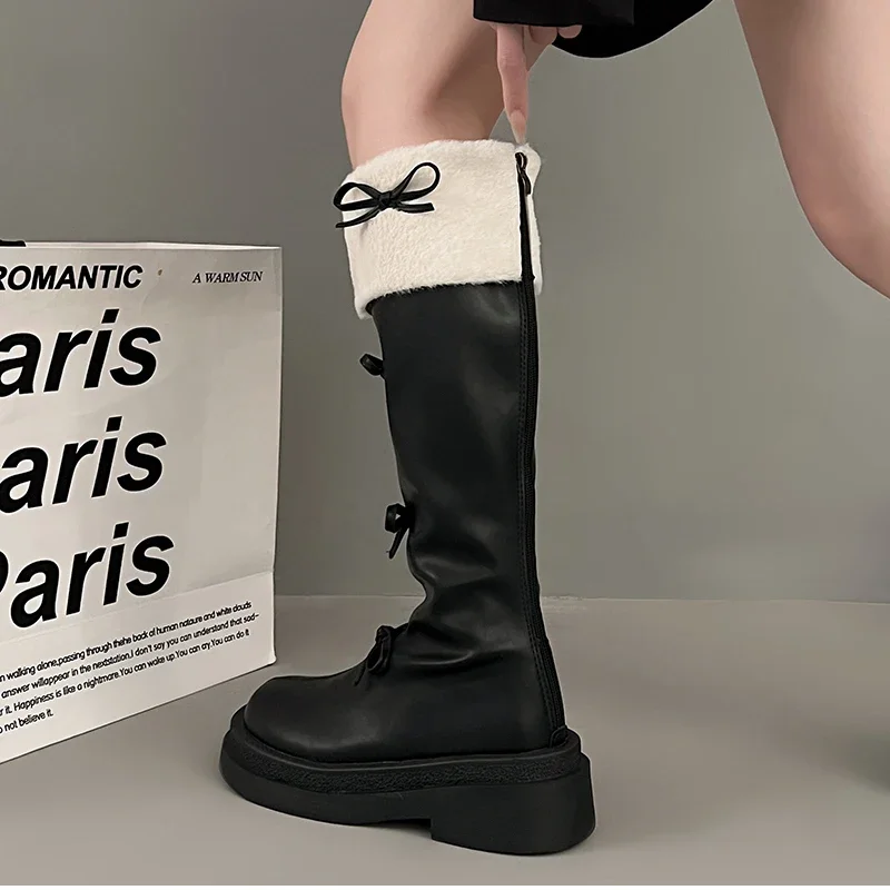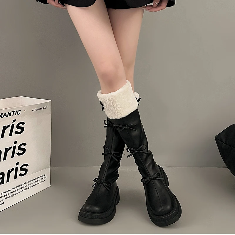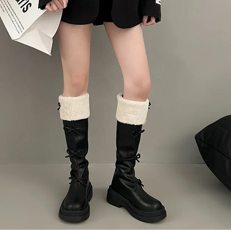 Otoño Invierno corto de felpa mujer hasta la rodilla Botas moda nudo de mariposa botines largos de caballero Botas femeninas
