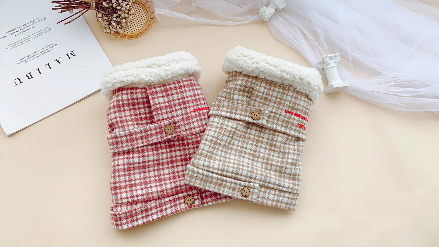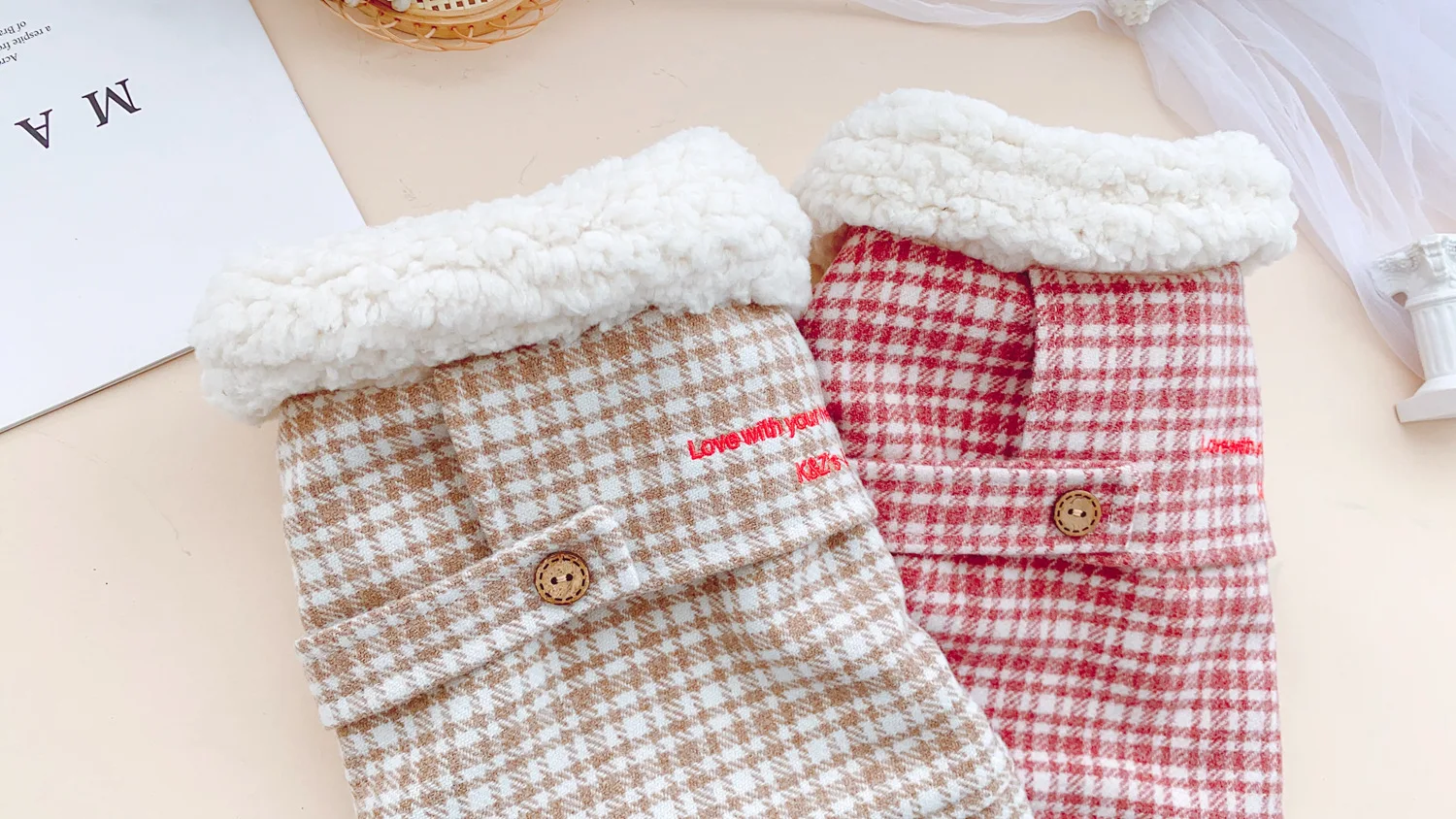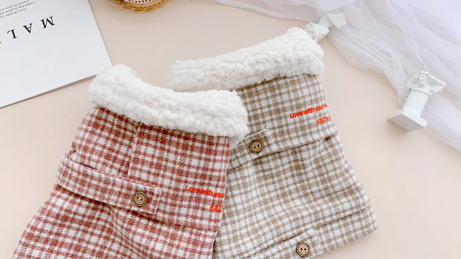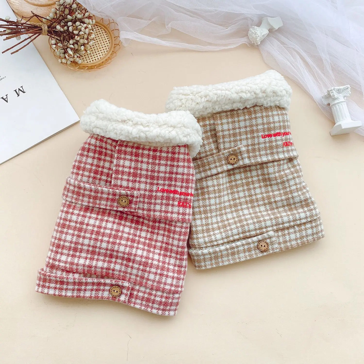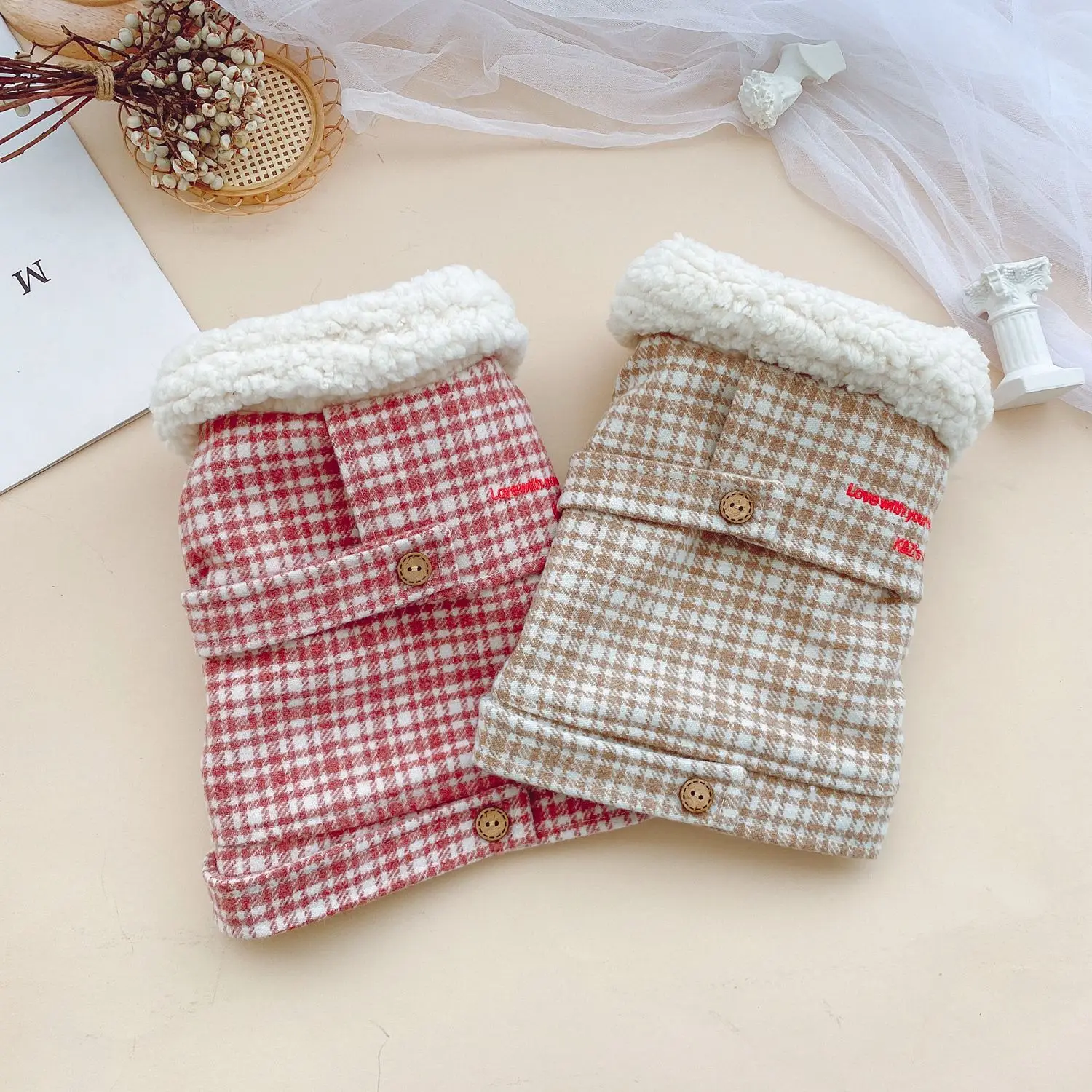 Otoño Invierno mascota abrigo de lana a cuadros Teddy dos tonos a cuadros Cuello de piel abrigo ropa de gato ropa de cachorro ropa de perro para perros pequeños