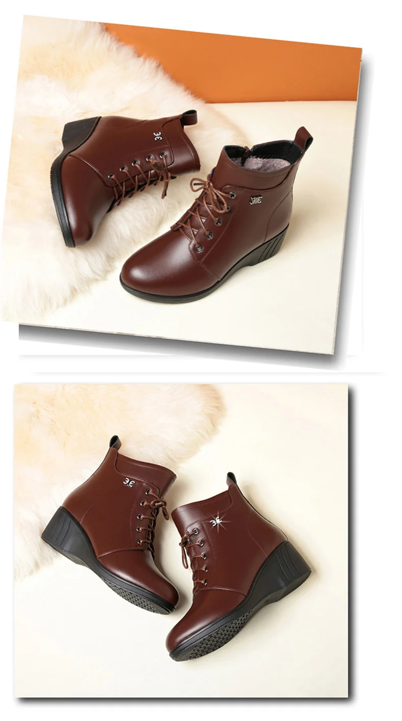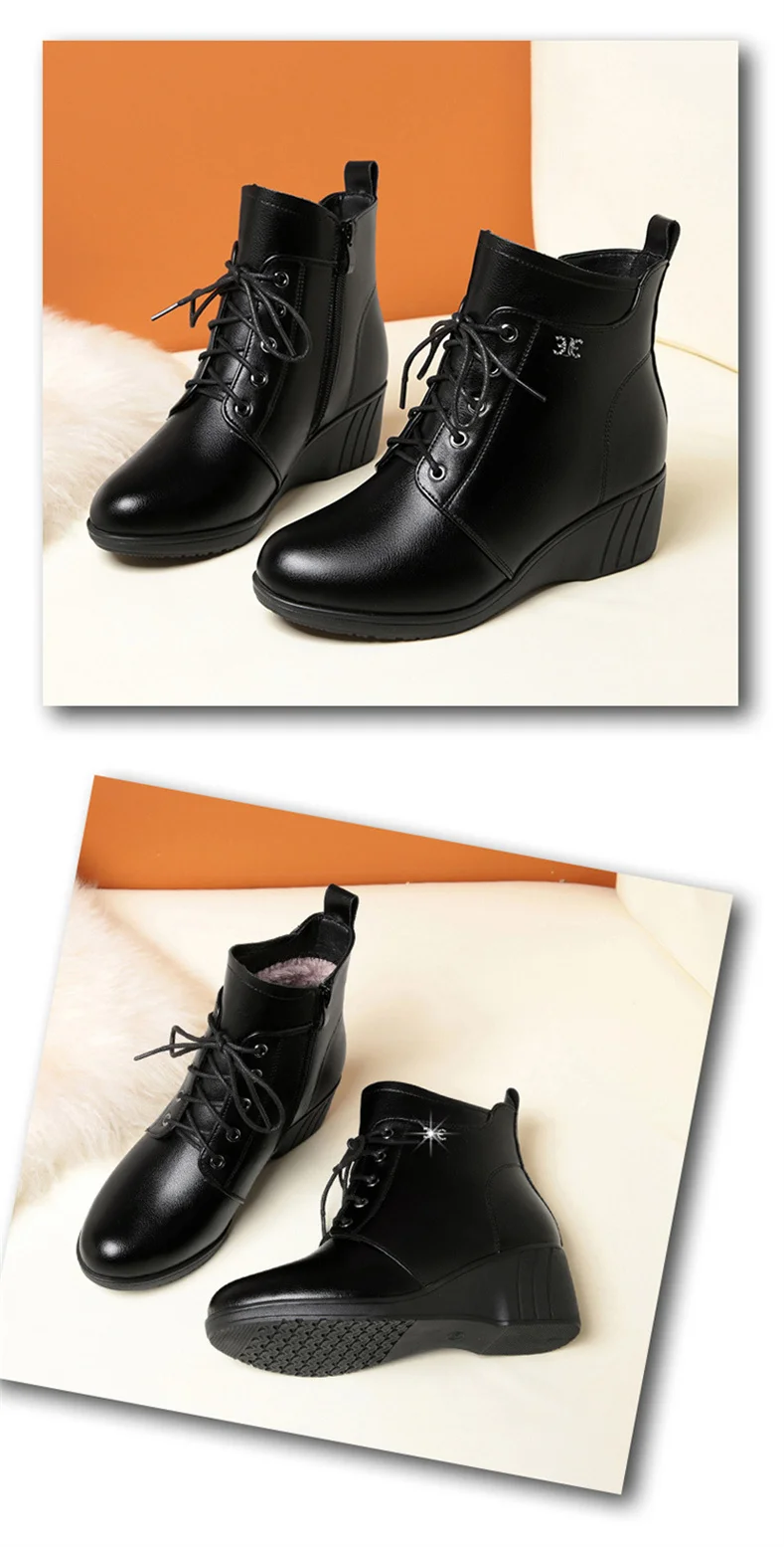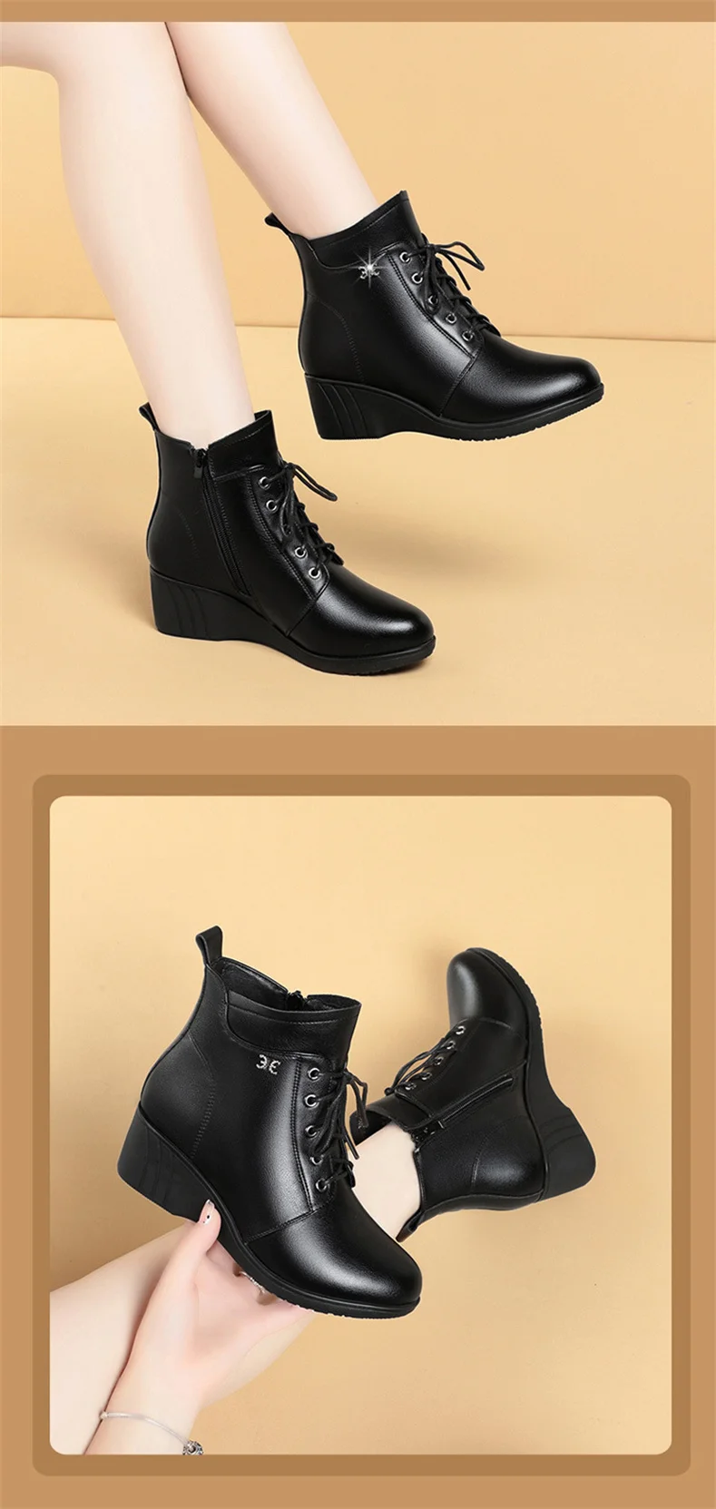 Otoño Invierno, zapatos gruesos de algodón y piel cálida, tacones altos para mujer, cuñas de cuero, botines de fondo plano de fondo suave