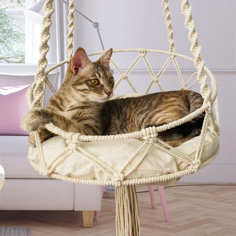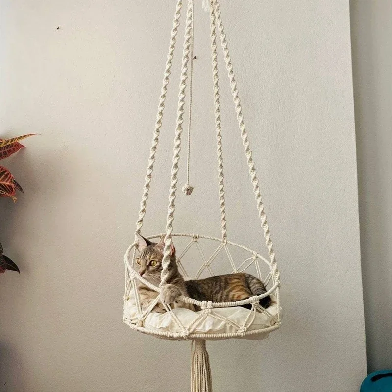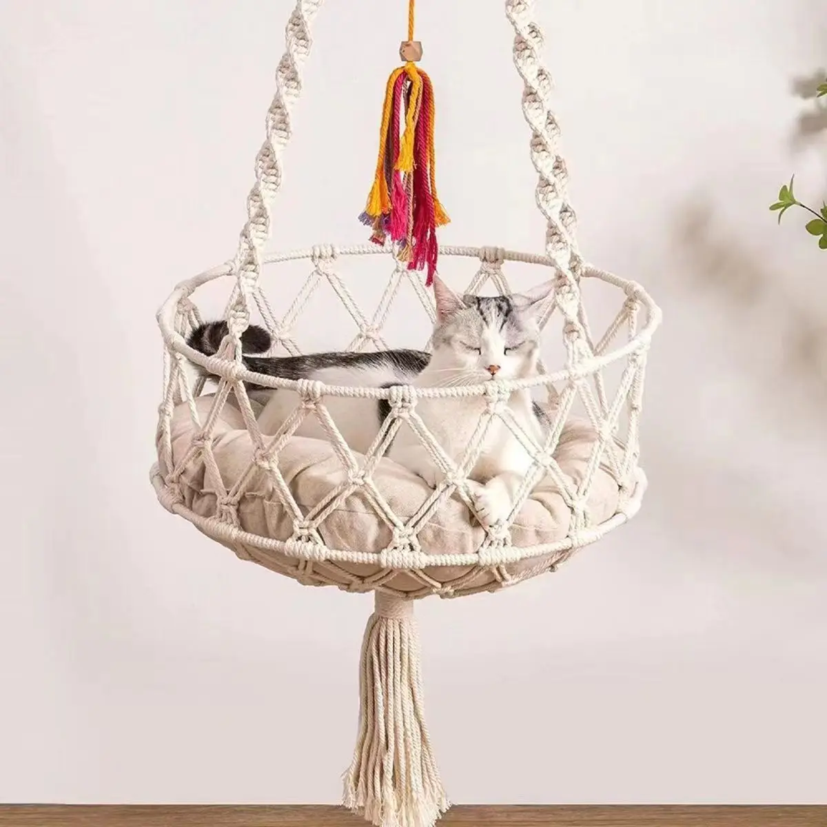 OUZEY-hamaca tejida a mano para gatos, columpio bohemio para gatos, cesta decorativa para interiores para gatos, cómodo para dormir, incluye cojín