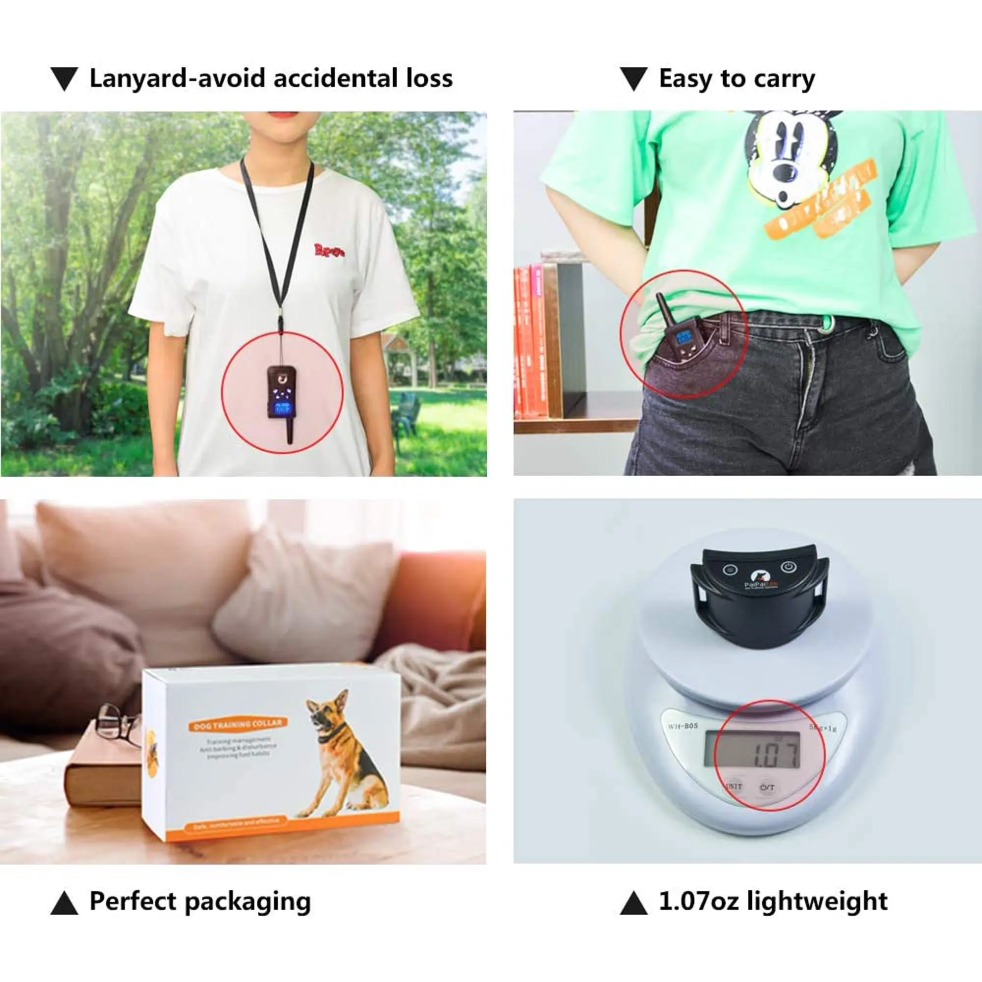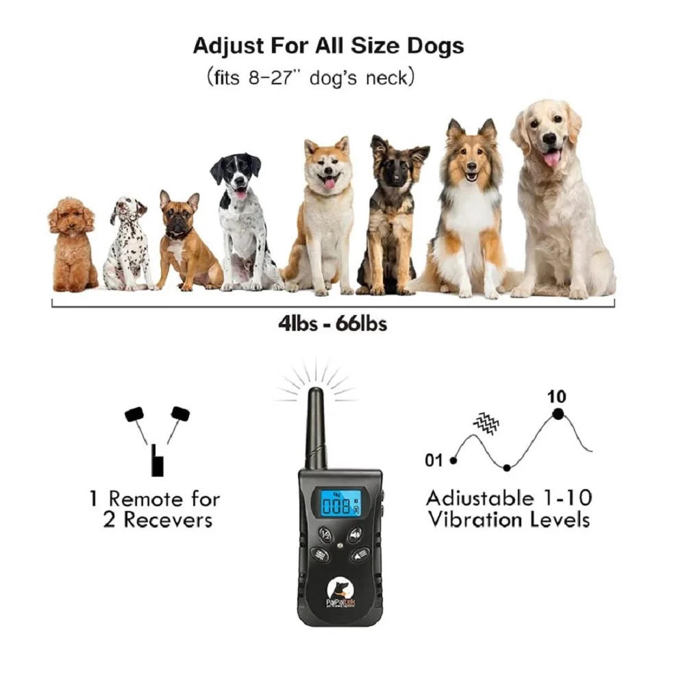 Consejos: 1.Cargue el transmisor y el receptor antes de usarlo. Cargue de 6 a 8 horas la primera vez; 2.Recomendamos usar este collar de adiestramiento para mascotas no más de 18 horas por día; 3.Si realiza un entrenamiento profesional, verifique la posición del collar durante 1 a 2 horas; 4.Si el collar es demasiado largo, recorte la parte larga correctamente; 5.Comprueba la tensión del collar.Se recomienda poner el dedo en el collar. No demasiado suelto, de lo contrario afectará el efecto de entrenamiento de los perros.
