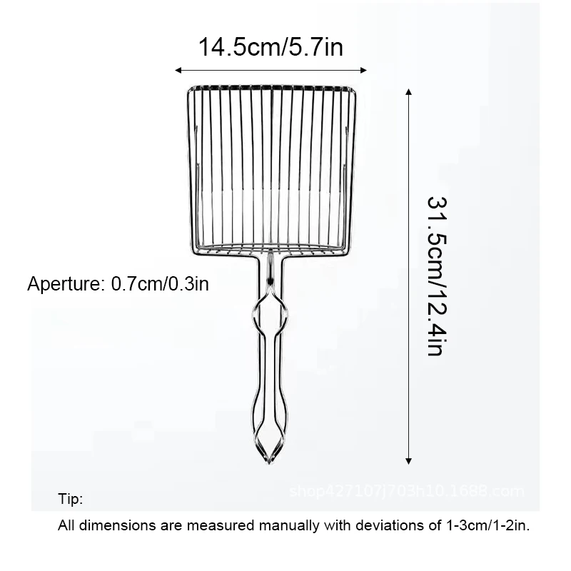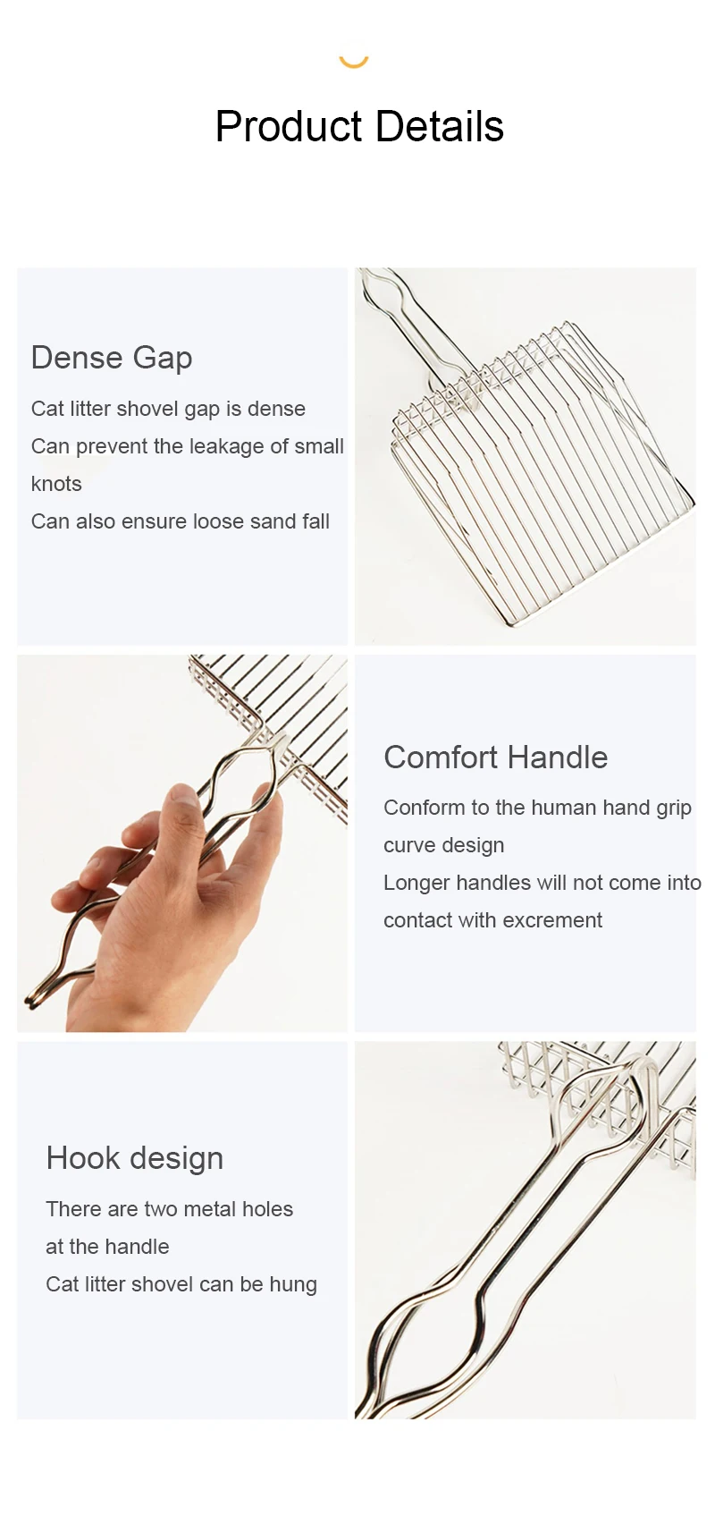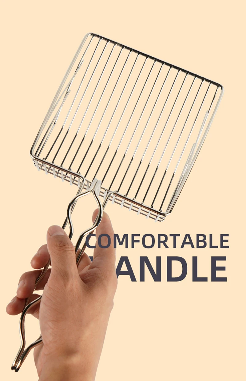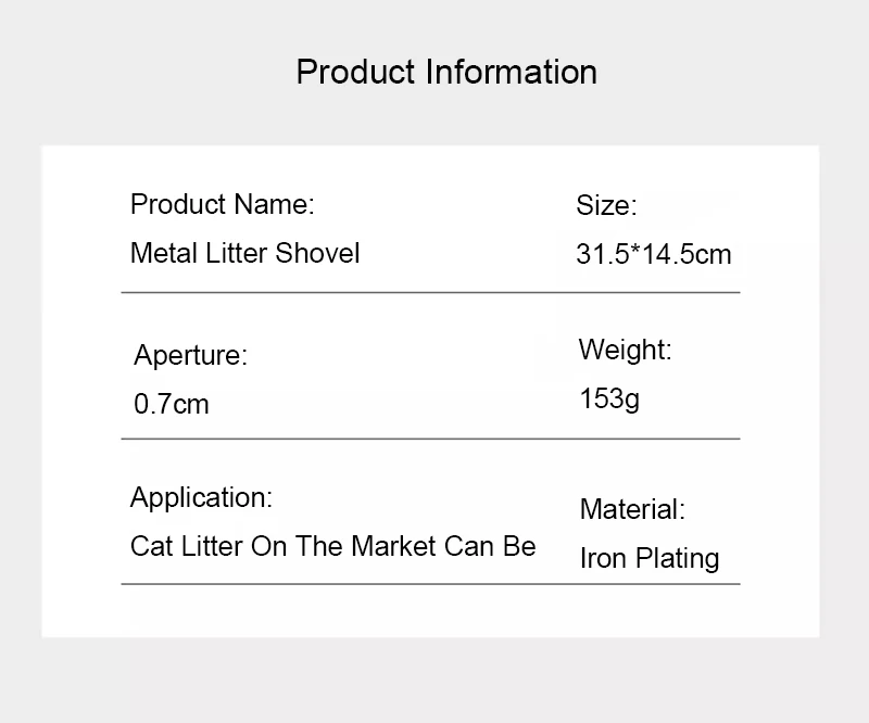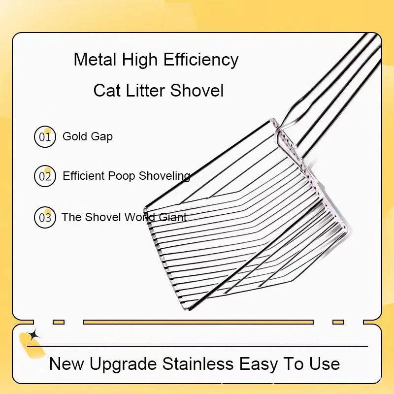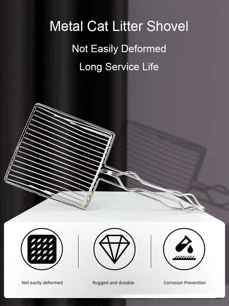 • Material de acero inoxidable :Este rastrillo para litter de gatos está hecho de acero inoxidable, garantizando durabilidad y resistencia al desgaste.